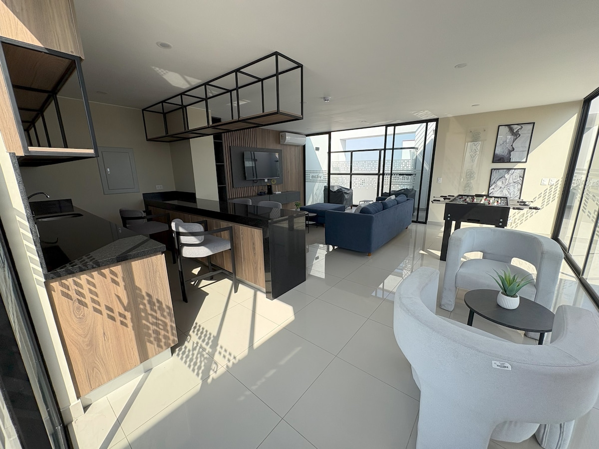 Lindo apartamento amueblado y equipado en lujoso edificio en el corazón de Barranco (distrito más turístico, cultural y artístico de Lima), límite con Miraflores. A pasos del malecón, de las mejores playas, del Puente de los Suspiros y Plaza principal. Áreas comunes en el rooftop (piscina, jacuzzi, zona de parrilla y fogata, coworking, salón de Yoga, zona gourmet) que te hará disfrutar tu estancia al máximo. Lugar cerca a los mejores restaurantes, teatros, museos, bares, discotecas y Larcomar.