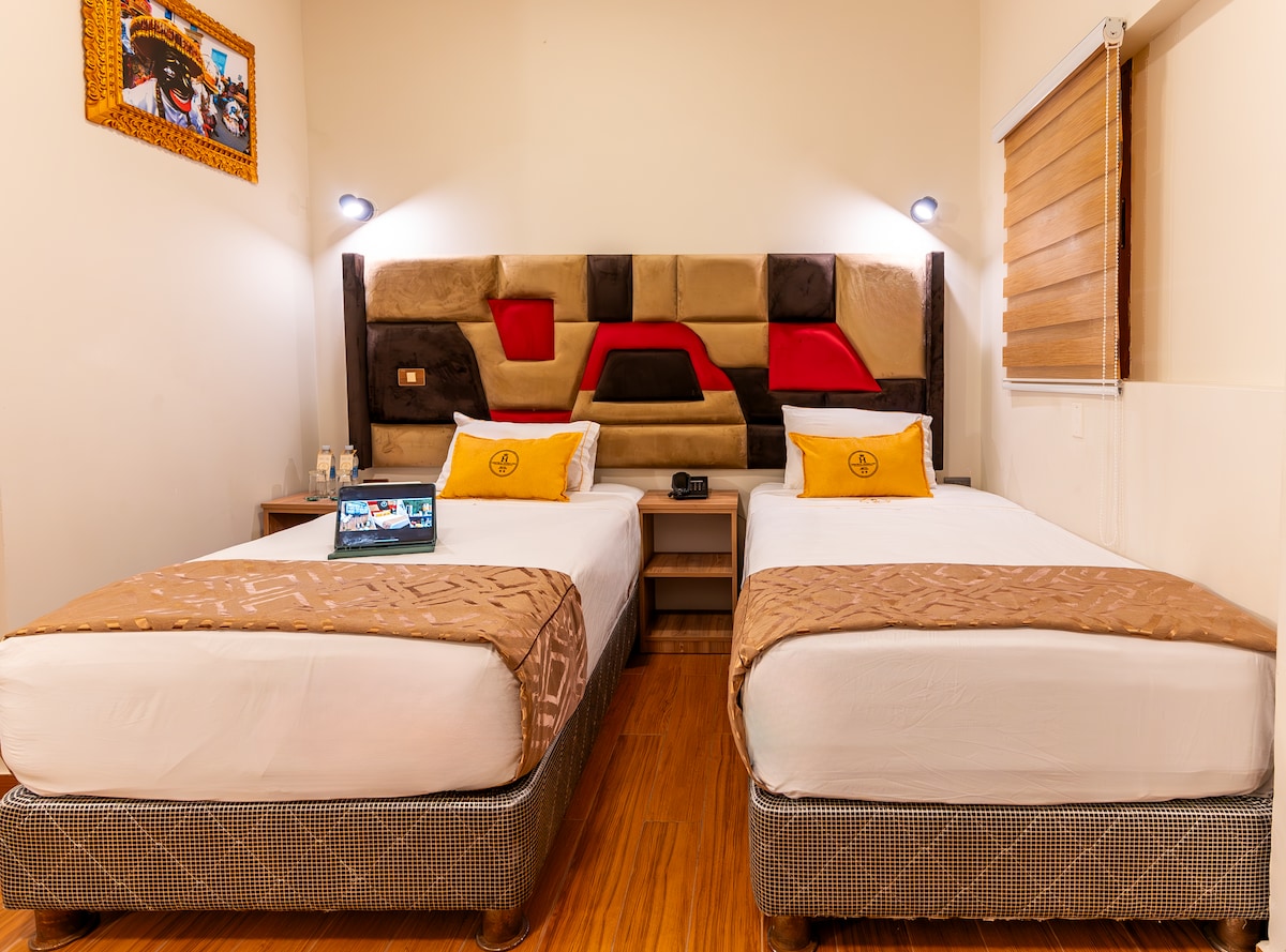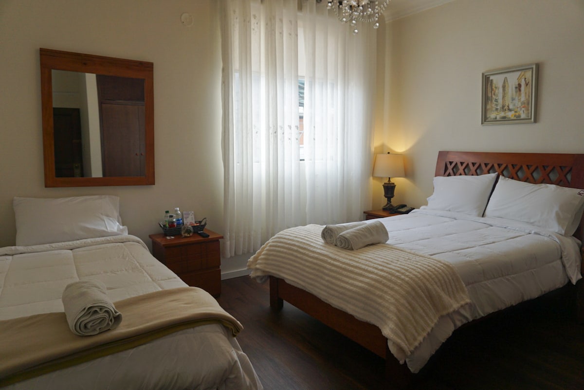 Habitación triple en el tercer piso de Monterrico Hotel Perú. Se encuentra ubicado en la Urb. San Ignacio de Monterrico un lugar privado, seguro y elegante. Aproximadamente a 15 minutos de Miraflores y a 50 minutos del Aeropuerto Jorge Chávez. Contamos con servicios adicionales como , desayunos, almuerzos, cenas , bebidas (aguas, cervezas, vinos, etc.). Habitación ideal para amistades o familia cuenta con 3 camas de dos plazas, aire acondicionado, Frio bar, armario, Wifi, etc.