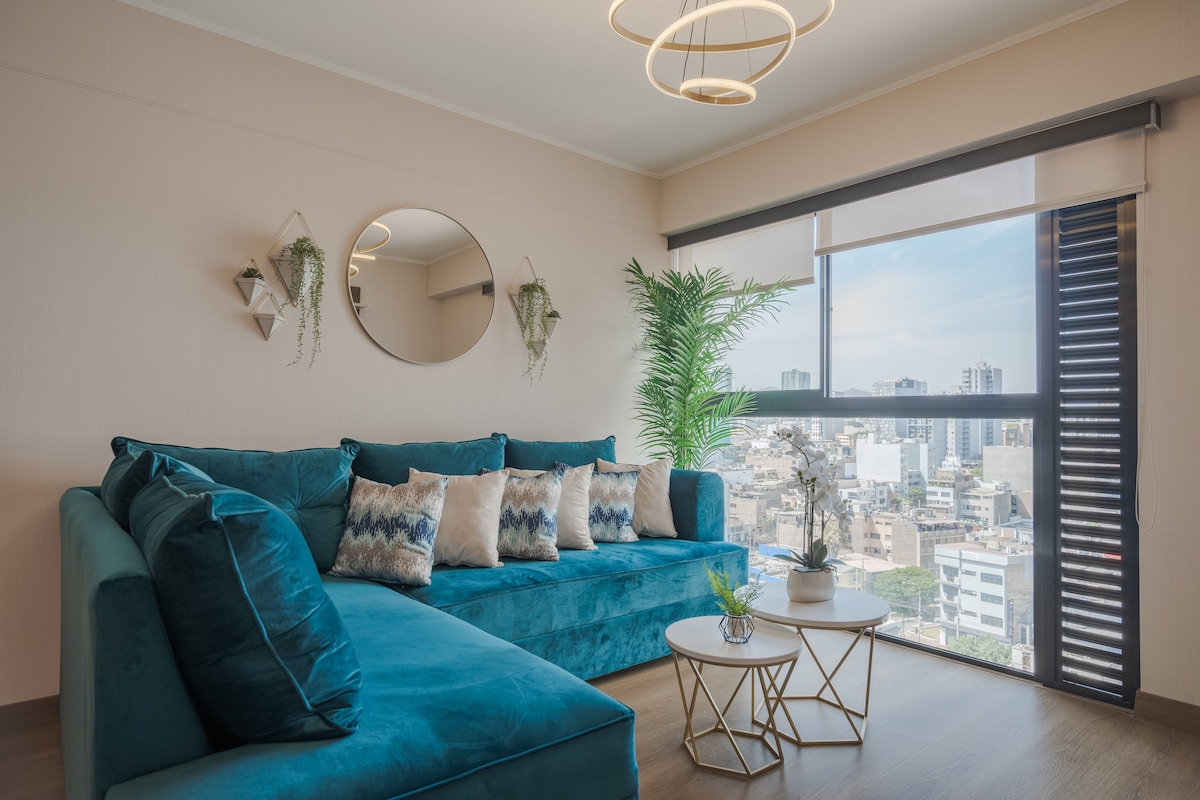 Beautiful apartment on Av. Salaverry near San Isidro, Real Plaza, universities, clinics, and embassies. Easy access to Historic Center, Campo de Marte, Magic Water Park, National Stadium, and Miraflores. Includes living-dining room, guest bathroom, kitchen, bedroom with en-suite, laundry, and balcony. Fully equipped, WiFi (400 Mbps), Smart TV in living and bedroom. Gym and pool in the building. Perfect for work or vacation, as a couple or family—you’ll feel at home.
