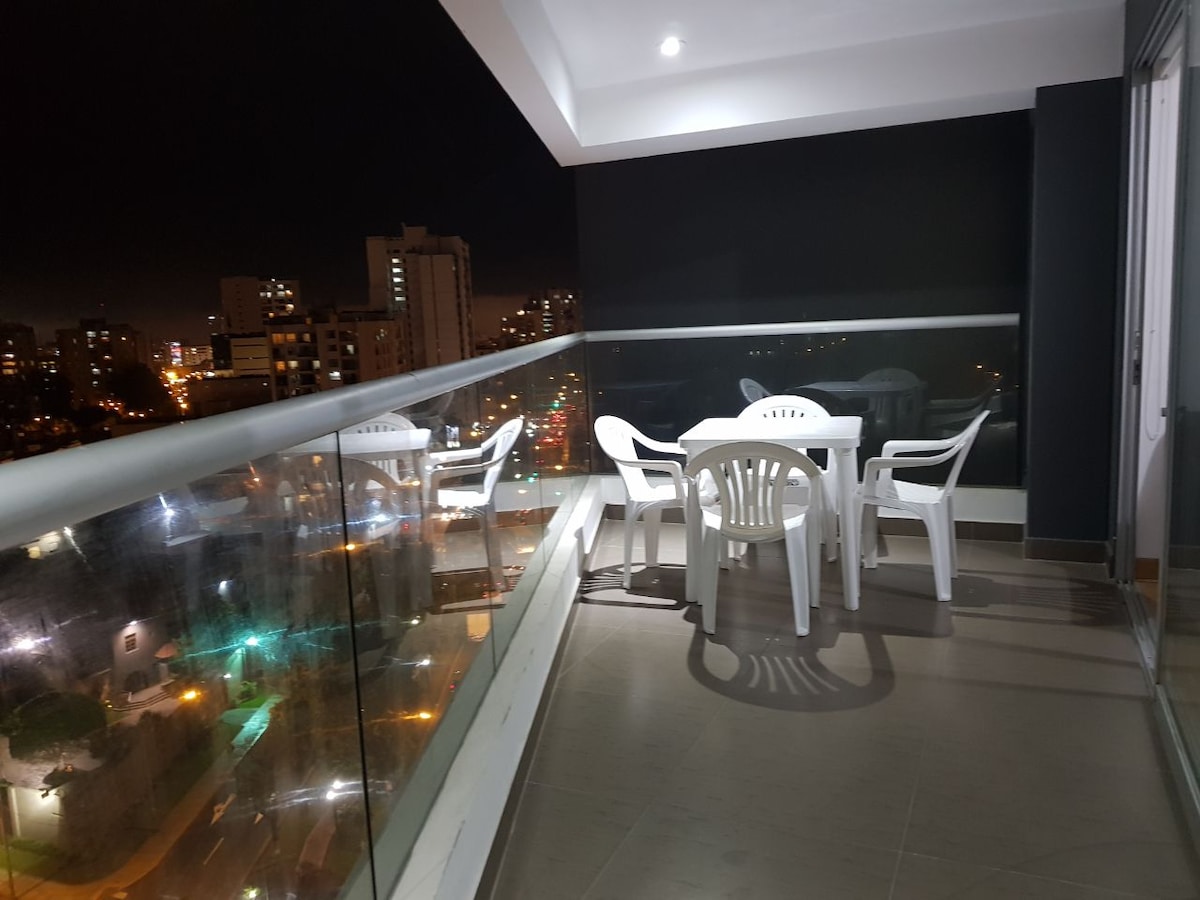 Luxury - Brand new Apartment , located in the heart of Miraflores district, the most touristic area in Lima. W/balcony, 2 large bedrooms, 2 bathrooms, a living area, 2 smart TVs, fully equiped kitchen, appliances, towels and linens. Also high speed 1000 MBPS Optical Fiber internet. Gym, 2 pools, club house and a pool and ping pong table. Shared spaces are common areas in 1st and 24th floor - • Para el uso de piscina y gym ingreso libre de acuerdo a disponibilidad.