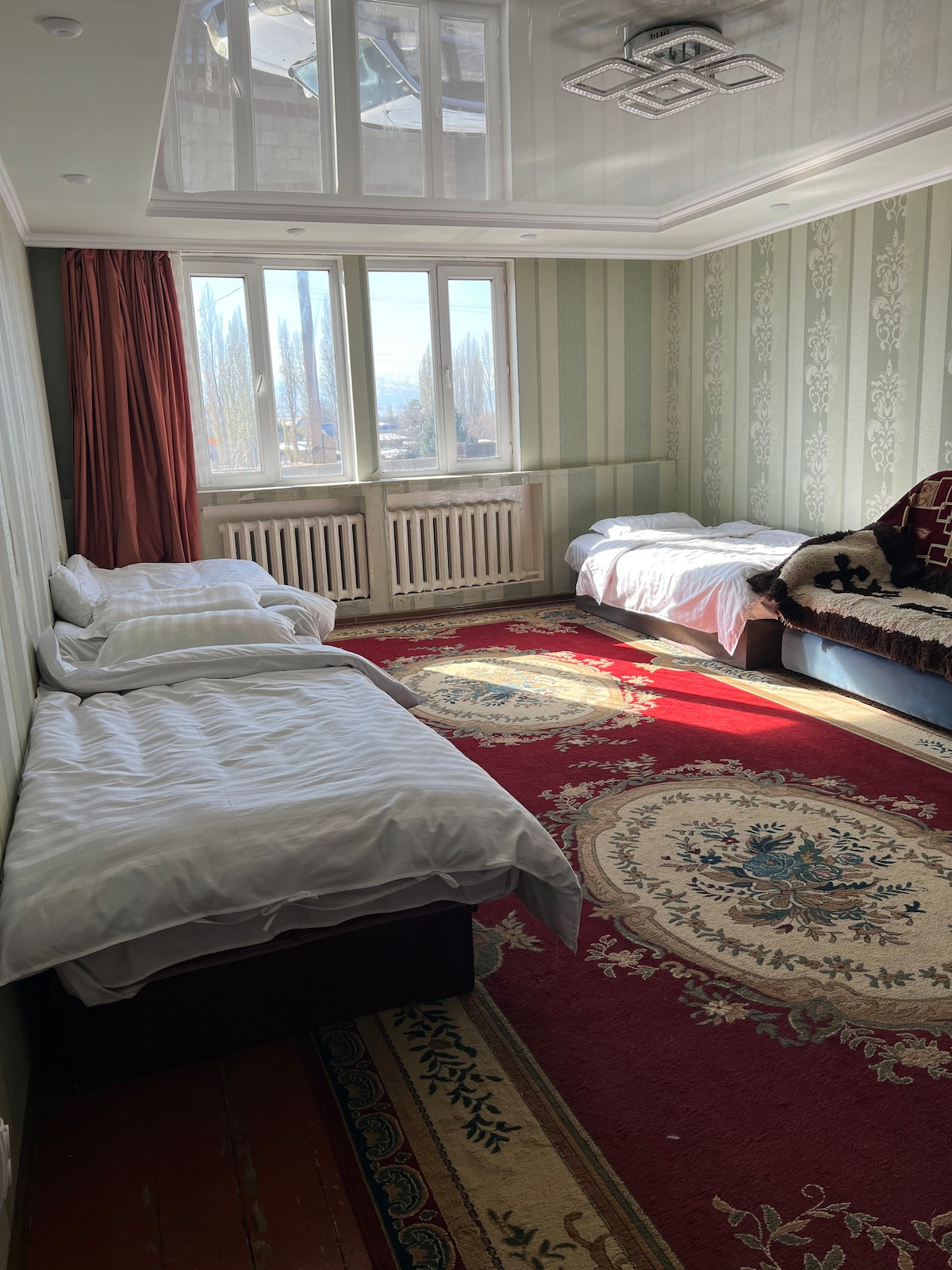A NEW guesthouse in ethnic style, crystal-clear air, and an incredible atmosphere - a perfect retreat in Kyrgyzstan! An eco-house. On the first floor, there is a large living room where you can relax and kitchen with all conveniences and appliances. On the second floor, there are 3 bedrooms, each with 3 beds.Each bedroom in the guest house has a toilet, sink, and shower.We are engaged in farming.There is a beautiful garden with 4 platforms by the river and 5 hammocks installed.