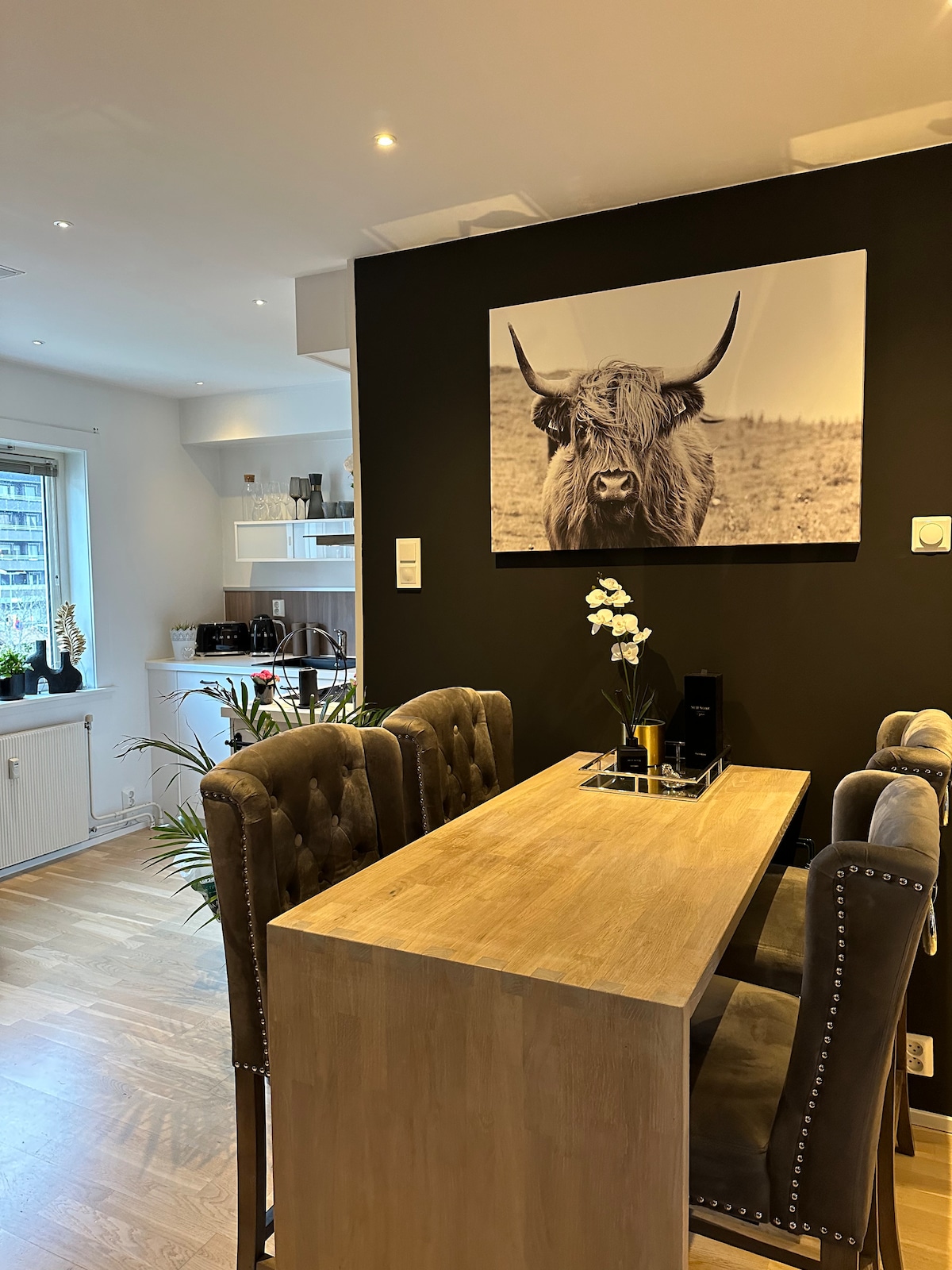 Flott utsikt, fin leilighet med 2 elghunder, som har eget rom under leiligheten, når bikkjene boffer, er det stort sett elg eller rådyr , mulig en rev eller to. Her kan man oppleve dyrelivet på kort hold.