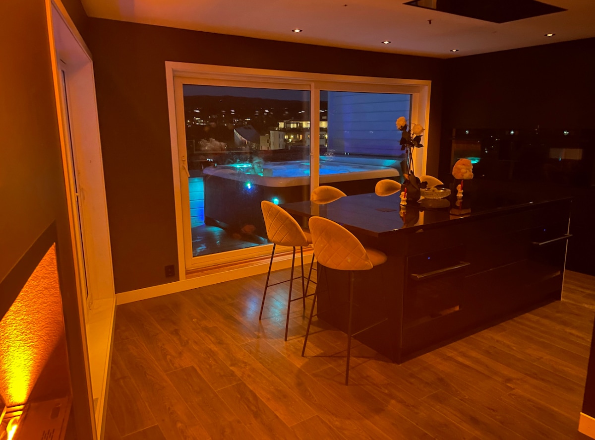 Lys suite for 2-4 pers. Oppreid seng til to pers. Grunnpris sengetøy,håndklær inkl. for 2 pers. Dobbeltseng i stue for 2 ekstra kr.250,- pr.pers Sengetrekk ,håndklær til 2 ekstra finnes,det legger dere på selv(: Ønskes tillgang til massasjebadet?Vi åpner og lukker og ekstra kostnad. 400,- i 1,5t. Dere er alene i massasjeb.. når dere har booket det for 1,5 time.Det er greit skjermet, vi bor i huset og bruker egen terrasse i andre etasje. Vi har begrenset innsyn til gjesters uterom på bakkepl.