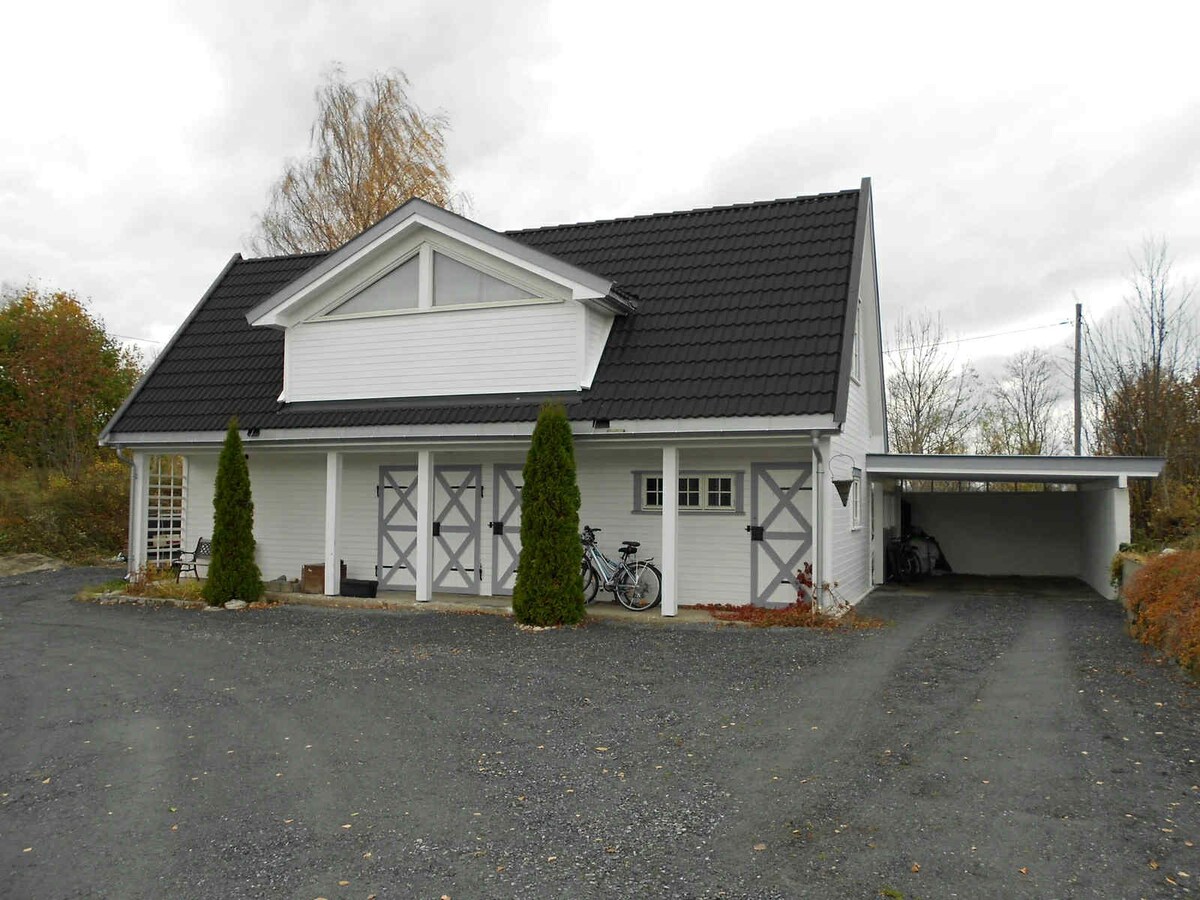 Relax with picturesque views of Randsfjorden, Norway's fourth largest fjord. Plenty of outside space to relax, enjoy the view and peaceful countryside, only a 5 minute drive to the town center, shops and Hadeland Glassverk. A few minutes more and you have access to Kistefos Museum and Hønefoss city. The property has all the modern facilities, underfloor heating, WiFi, TV, microwave, toaster, kettle, fridge and private parking. NO OVEN OR HOTPLATE IN KITCHENETTE