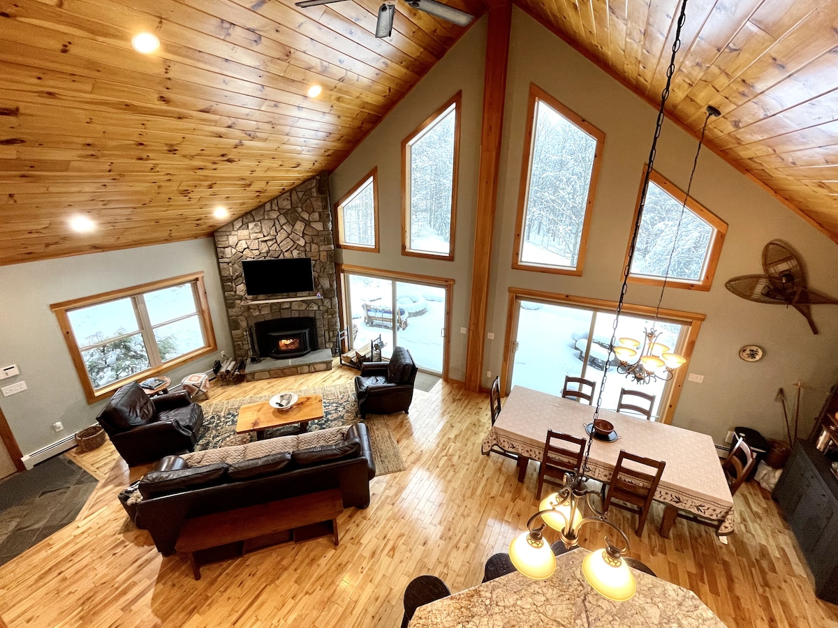 Spacious, peaceful lux cabin atop the Catskills. Enjoy mountain views, make smores, & soak in the hot tub. Catch up in the vaulted room by the fireplace w/ our wide game selection, while others watch movies downstairs. Host a dinner party with our fully equipped kitchen. Centrally located, 20 mins to 6 towns. Visit breweries, antique shops, dine, hike, fish, golf, or relax. Fast 600mbps internet. Perfect for groups, families, kids & pets. WFH, newborn, pet friendly. 3+ nights get discounted rate