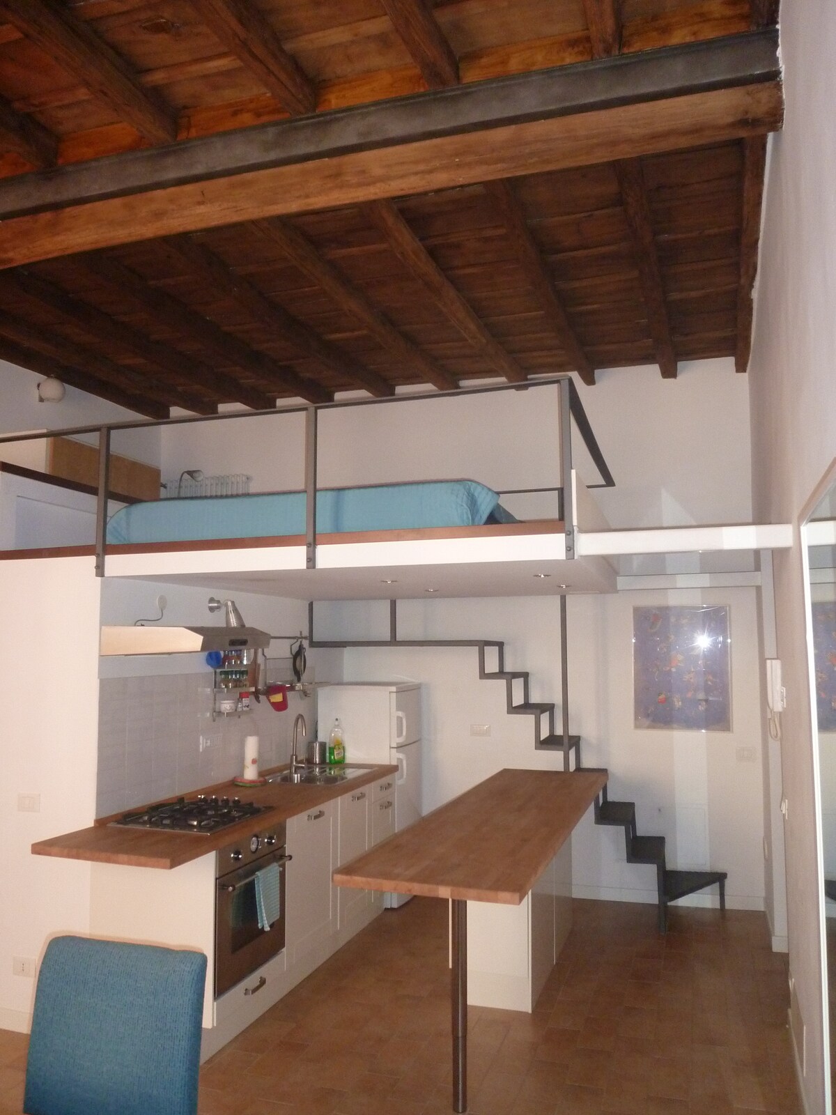 Loft in Trastevere, a building from the early 1900s, is on the 6th floor (up to the 5th with elevator, plus a flight of stairs). 360° view of the most famous beauties of Rome: from St. Peter's to the Capitol, etc. Renovated and furnished: air-conditioned in winter and summer; built-in appliances class A - kitchen area; - dining/study area; - living area with Queen Size sofa bed; - sleeping area (foldable double bed); * bathroom with shower; * bathroom with bathtub. * a large usable terrace.