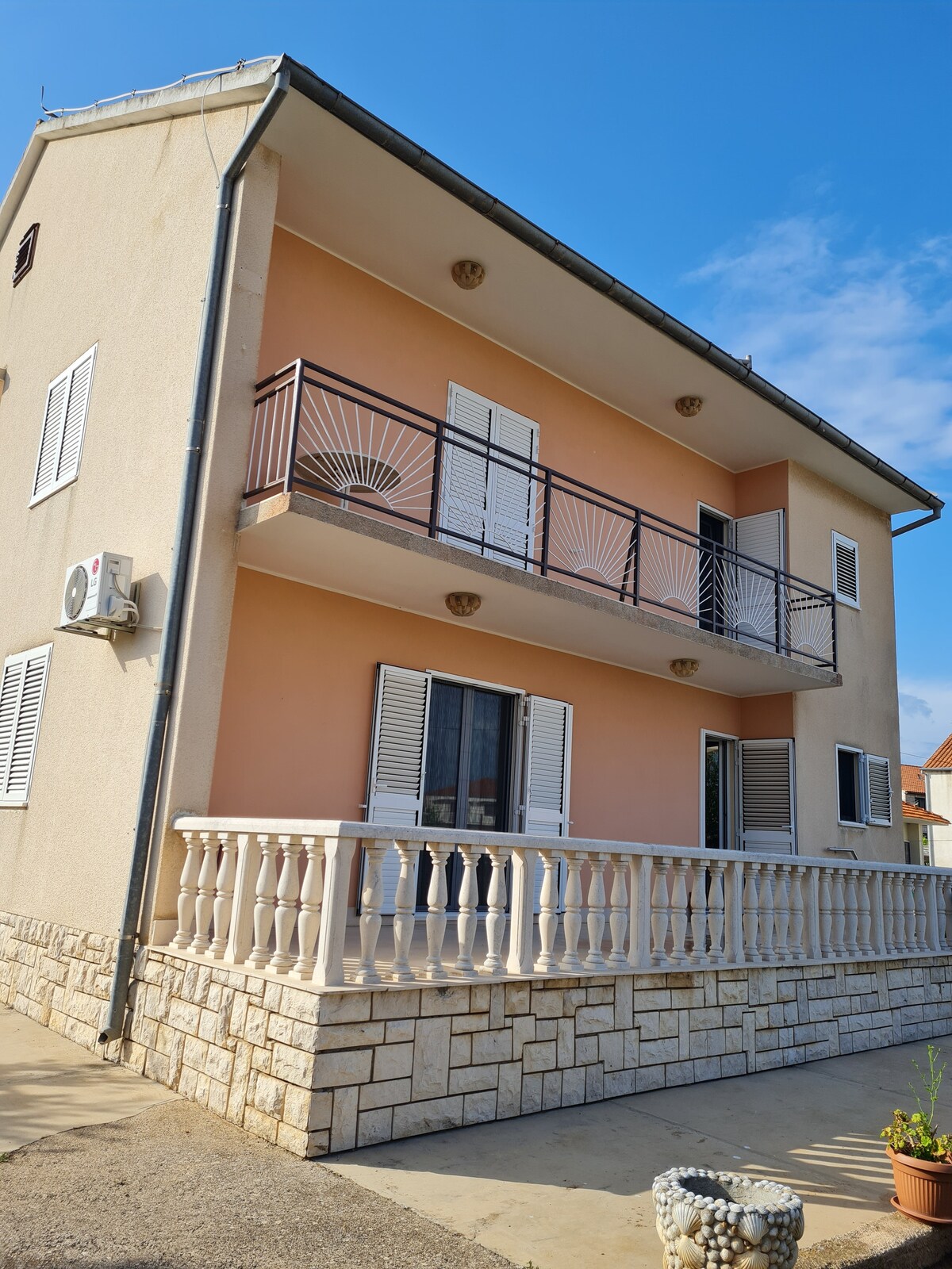 Detached house with 2 apartments with own land next to the beach which includes a small grove. The house is located overlooking the Kornati National Park. Nearby there are tennis courts, the possibility of a boat trip to the Kornati National Park or a car to the Krka National Park. 2 bedrooms, 1 bathroom, livingrom with kitchen, outdoor shower.
