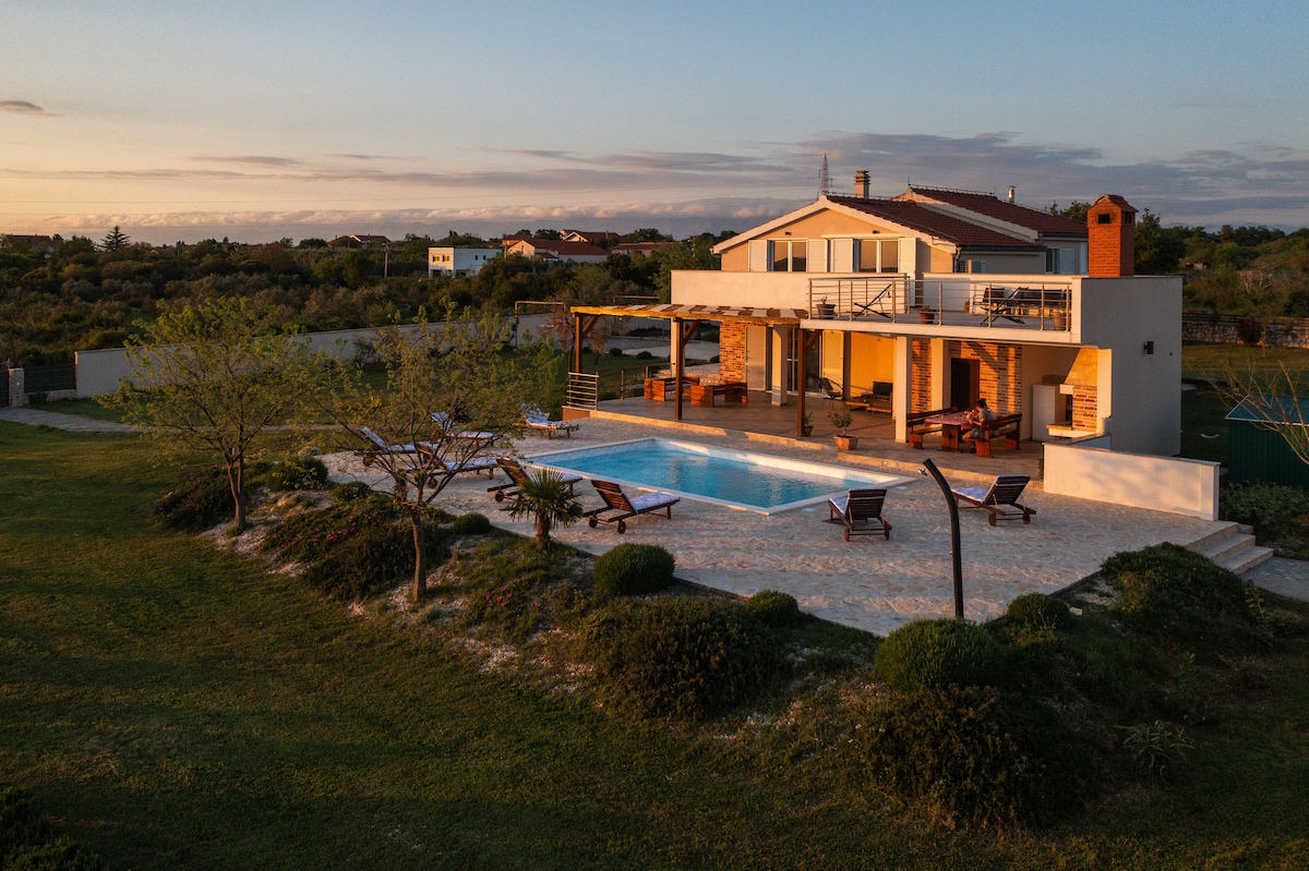 This beautiful villa with heated pool, hot tub and sauna is set on a remote and secluded landscape with a breath-taking view over the valley Heated pool from April to November Great place for relaxing and a starting point for exploring the region and Croatia! City distance Zadar is 28 km (airport 20 km) away Šibenik is 50 km away Split is 125 km (airport 99 km) away Attraction distance Plitvice lakes 125 km away Krka 45 km away Kornati 30 km away