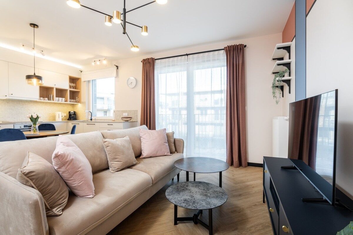 Komfortowy, w pełni wyposażony apartament w nowym budynku. Salon z otwartą kuchnią podzielony na część jadalną i wypoczynkową. W sypialni znajduje się duże łóżko i przestronna szafa. Jest także garderoba jako dodatkowe miejsce do przechowywania. W okolicy znajdują się sklepy, restauracje i kawiarnie Wyposażenie: klimatyzacja, ekspres, czajnik, żelazko, deska do prasowania, pralka Dojazd z Lotniska Chopina 20 min taxi 50 min komunikacja z Lotniska Modlin 50 min taxi 120 min komunikacja