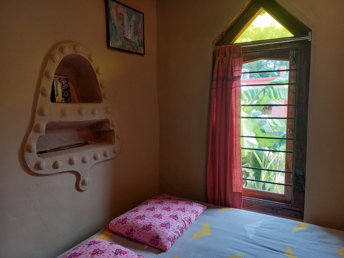 Beautiful two-storeyed artisan villa nestled in the midst of an orchard & kitchen garden lush with flowers. Surround yourself in lush greenery and abundant flowers in a house meticulously designed by artists with all their love. Enjoy the rich cultural heritage of Shantiniketan, Bolpur with Sonajhuri Forest, Kopai River & Visva Bharati University all within 10 mins distance. The nearest railway station is Prantik, also 10 mins.