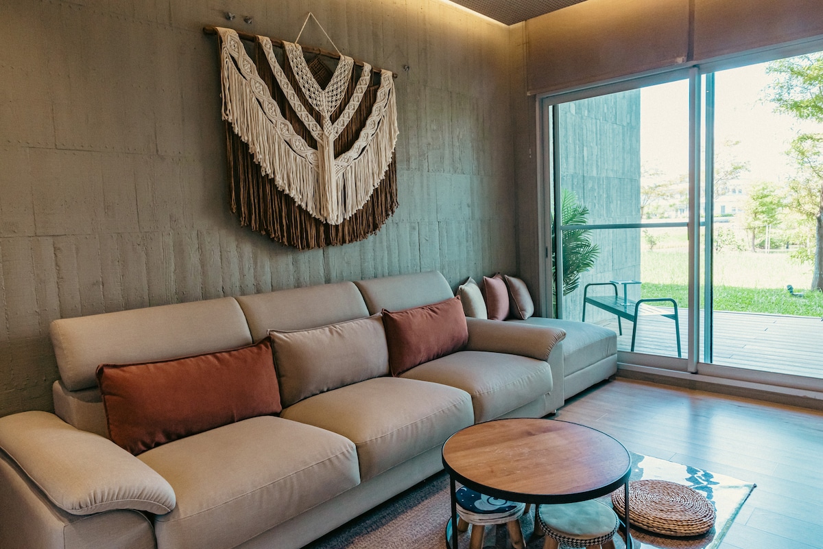 松田songtian民宿 灰與白組成的現代化外觀,展現低調的日式現代風華,沒有奢華喧鬧的裝潢擺飾,低調沉穩,營造出一種健康舒活的氛圍,色彩協調又富具大方氣度,大廳空間則以明亮的光線,在雅緻的空間搭配藤編、原木材質的各式桌椅和圖騰布畫等充滿原始美的特色家具,組成一處溫馨協調而具特色的區域,提供旅人談天小喫的舒適空間