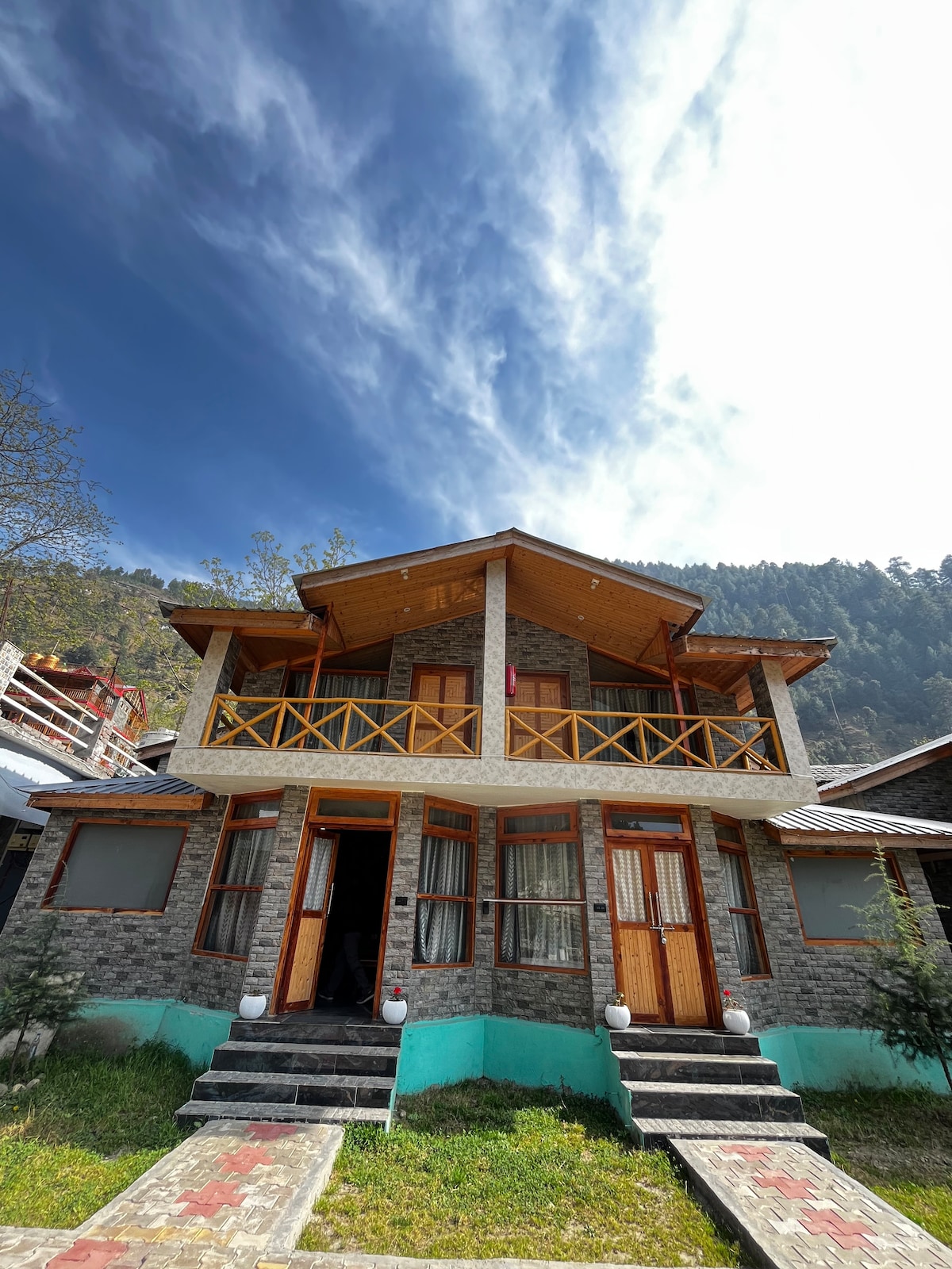 Tirthan Chalet is a peaceful 5-bedroom mountain retreat located in the heart of Tirthan Valley, surrounded by a private persimmon fruit orchard. Spread across three thoughtfully designed units—including a traditional Kath Kuni stone cottage, a comfortable family cottage, and a scenic glass house with jacuzzi—this stay is ideal for families and groups seeking nature, privacy, and authentic Himachali hospitality.