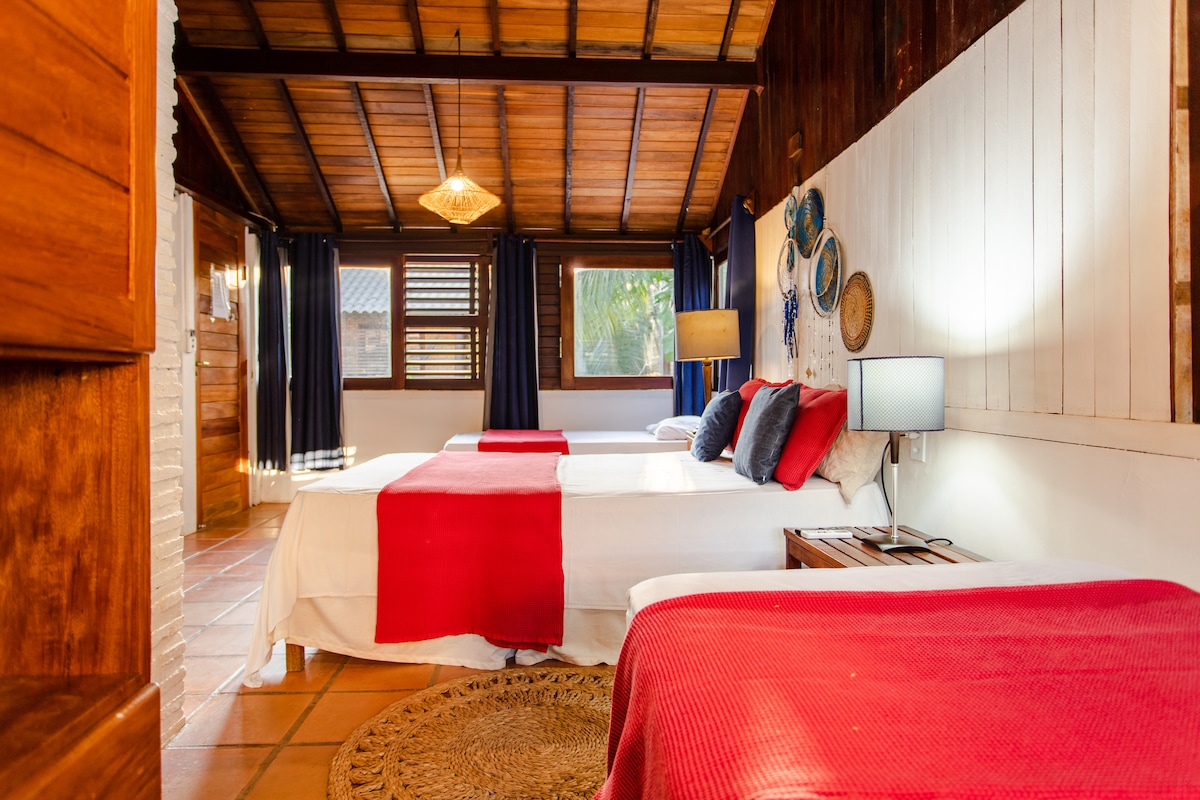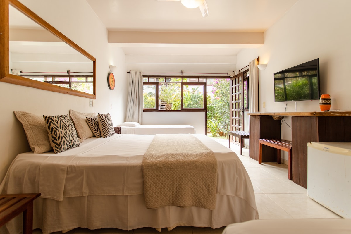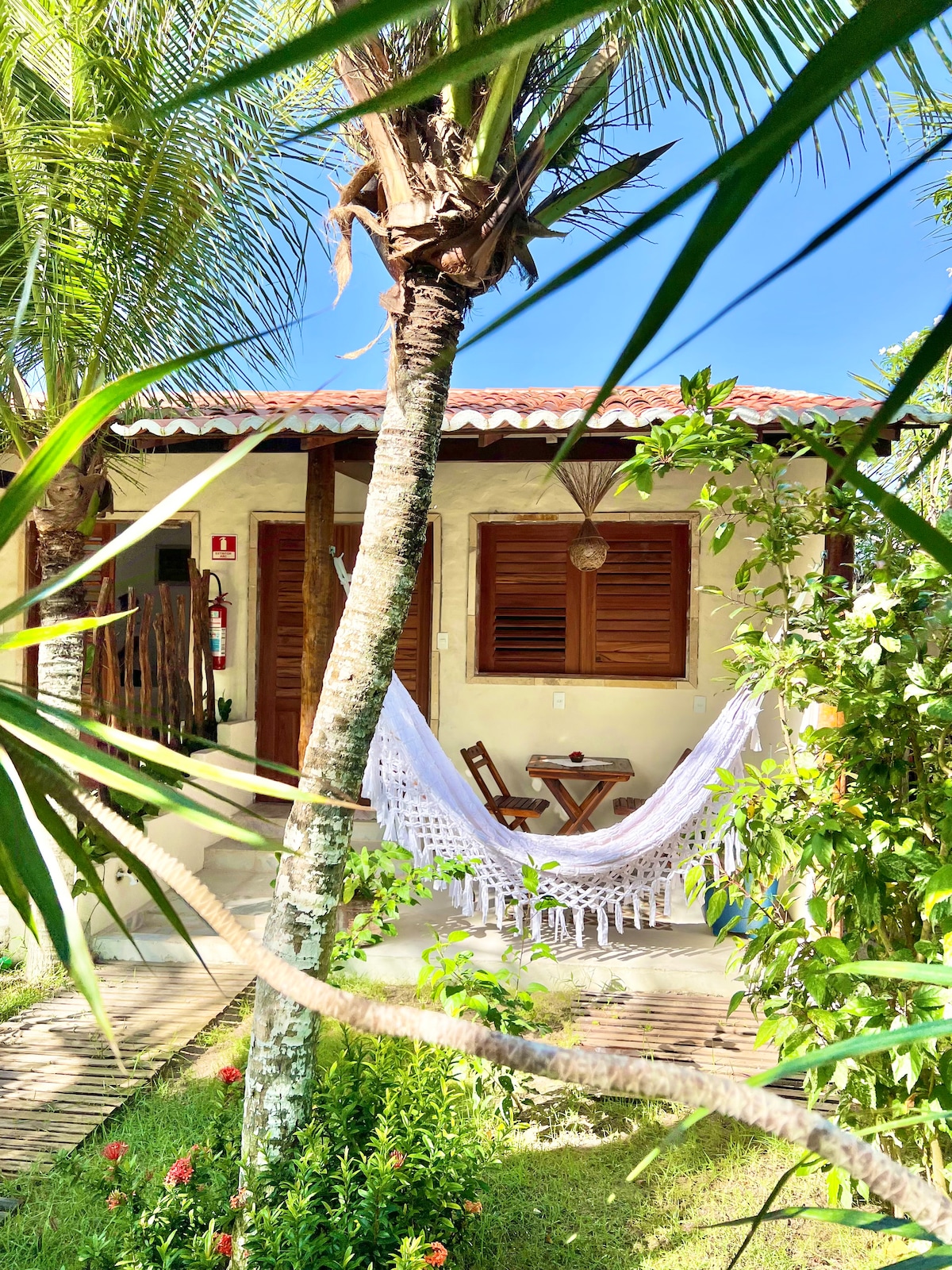 Cada suíte acomoda no máximo 3 pessoas, oferecendo uma cama de casal e um colchão extra de solteiro. A suíte também inclui uma varanda com rede e um pequeno quintal privativo com jardim.