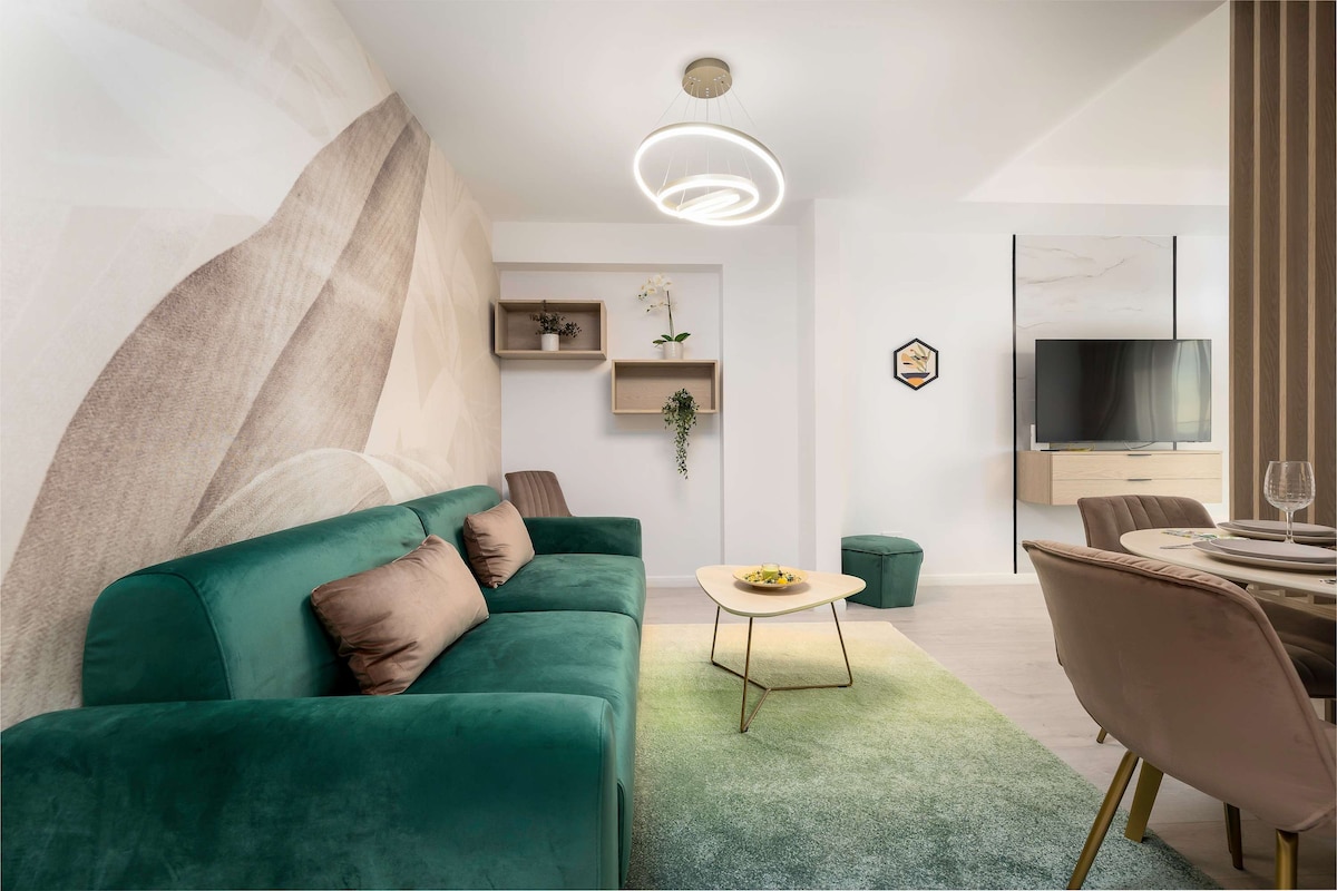 New and modern apartment - feel at home in a quiet area, just 5 minutes walk from the metro station. The old city center of Bucharest is only 15 minutes away, so you can enjoy the charm of the city. Relax in the private garden and enjoy a delicious coffee, admiring the green grass. The apartment has WiFi6, dishwasher, washing machine with dryer, coffee maker, air conditioning, TV and a very comfortable sofa bed for a restful sleep.