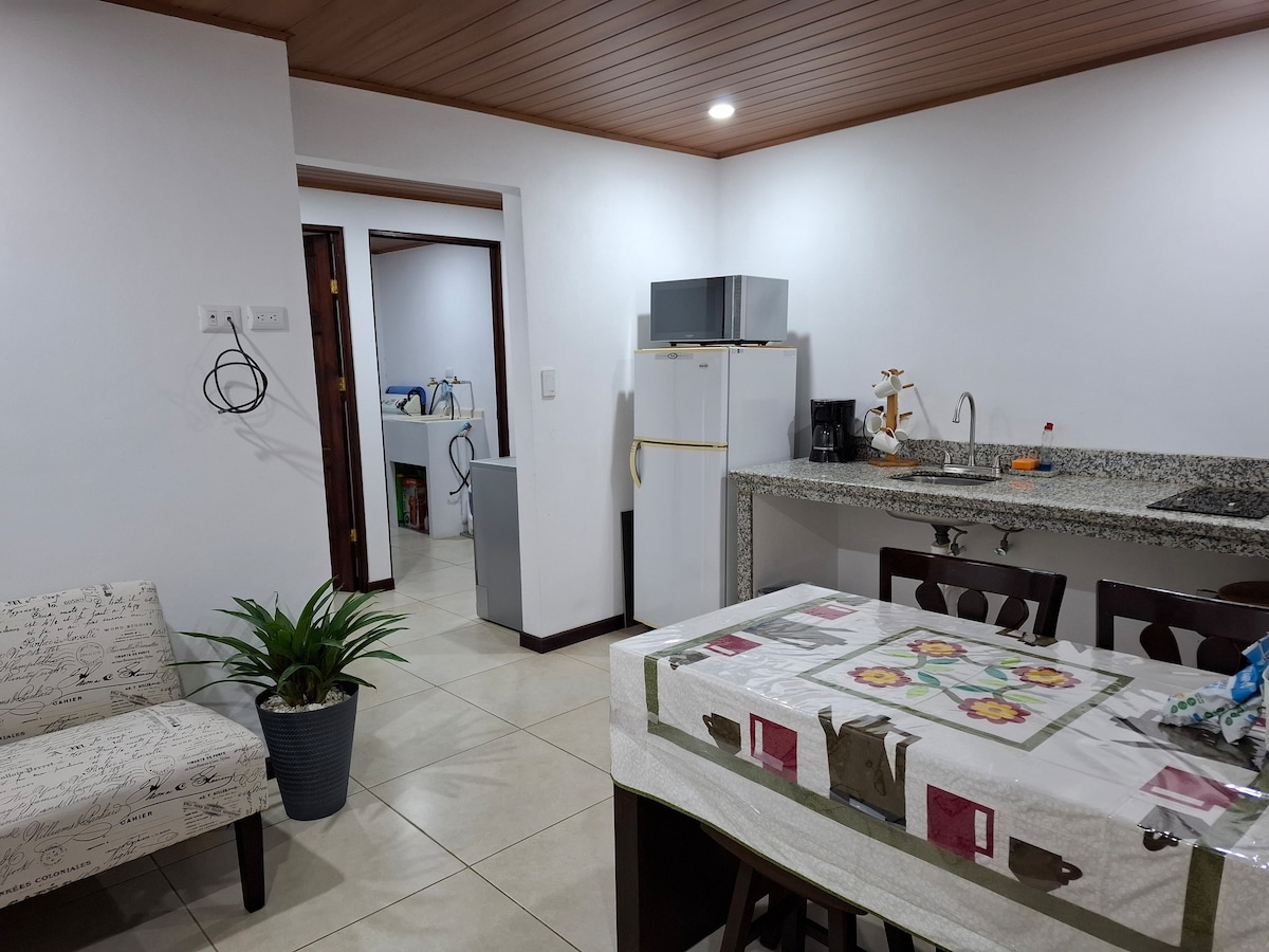 El apartamento está totalmente amueblado; tiene agua caliente, TV (con Magis), cocina, microondas, refrigeradora, utensillos de cocina. Internet fibra óptica, 300 Mbs. Limpieza 2 veces a la semana (para estadias largas). Para estancias mayores a una semana hay acceso a un espacio común de lavandería. Hay dos mini súper al frente. Se ofrece espacio de parqueo PERO HAY QUE SOLICITARLO PREVIAMENTE PARA RESERVARLO. El parqueo es para vehiculos medianos o pequeños, PERO NO PARA VEHICULOS GRADES.