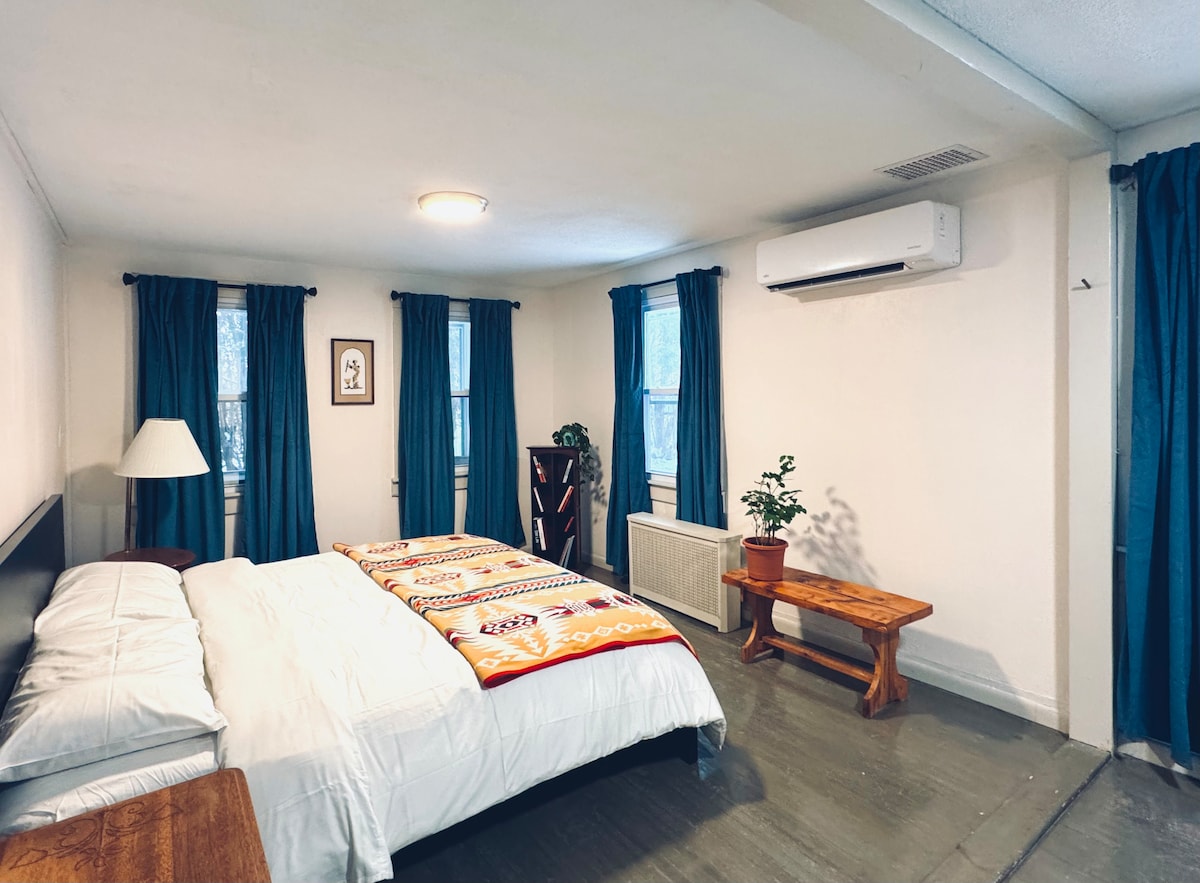 Near ⛷️ SKI resorts: Jiminy Peak, Berkshire East Mountain and others. A large, private 2-bedroom apt at the Small Mansion of Chase Hill Estate. Outdoor Sauna! Just a 5 minute-walk to MASS MoCA & downtown restaurants, 10 mins drive to Williams College & Clark. Whimsically restored (fast Wi-Fi & great water pressure!) and part of @chasehillartistretreat ✨ Your stay supports pro bono residencies for refugee & immigrant artists. Additional dates available beyond what the calendar shows—contact us!