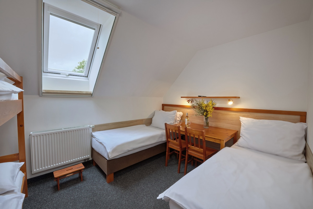 Prostorný pokoj se třemi lůžky a vlastní koupelnou se sprchou. K dispozici je televize, dostatek úložného prostoru a bezplatné Wi-Fi. Parkování je možné přímo u penzionu, je zde také terasa k posezení a možnost využití úschovny kol. Snídaně je k dispozici za poplatek.