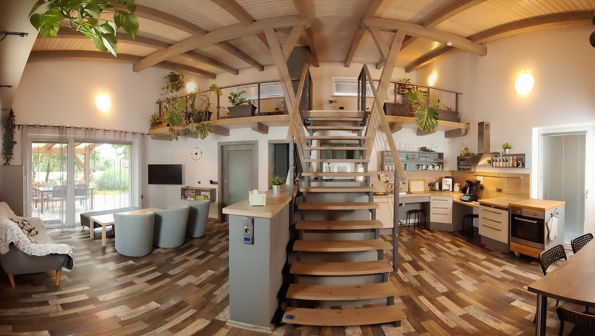 My bee farm offers unique accommodation in the picturesque countryside near Telč. In addition to cozy living quarters, the farm offers the following: – Sauna with a pond for cooling off (see additional description) – Apidomek (see additional description) – Outdoor seating area with a grill – Balcony overlooking the domestic animals – Adjacent playground for children and a sports court for basketball/tennis/football, etc. – Shop selling honey and honey products – Dog kennel – And much more!