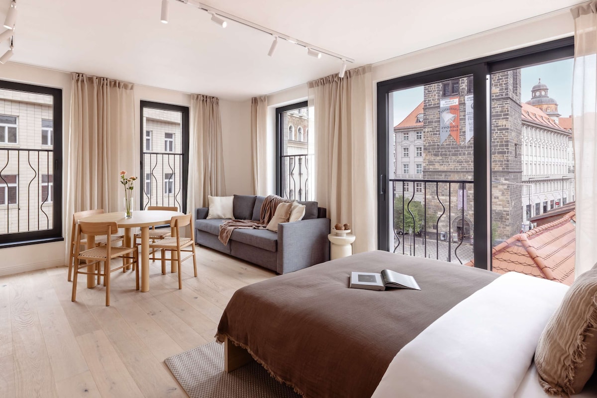 Brand new spacious 1-bedroom apartment for up to 6 persons with airconditioning and elevator in Harrachovsky palace residence. It is 3 min easy walk from Wenceslas Square, Municipal House, Jindrisska Tower, Palladium shopping mall and Opera. Very cozy bed, light, kitchen and spacious bathroom with a bathtub. Ideal for families, couples, solo travellers or business travellers. 3 minutes from Central Station, all attractions, restaurants, shops and bars within a walking distance.