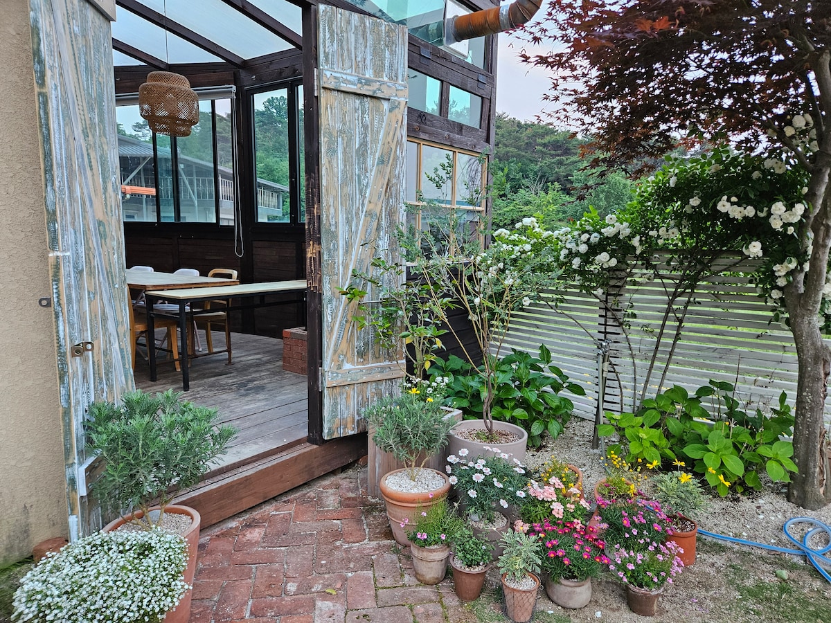 진주 ‘구월아뜰리에 집’ 은 카페 겸 빈티지 소품샵인 구월아뜰리에의 두번째 공간입니다. 구월아뜰리에 집은 1970년도에 지어진 한옥 본채와 1980년대에 지어진 양옥의 별채가 기역자로 연결된 복합 공간입니다. 한옥 본채는 숙박 공간으로 운영되고 양옥 별채는 현재 전시 및 판매 공간으로 준비중입니다. 솟을대문부터 손님을 맞는 구월아뜰리에 집에서는 오래된 기와지붕 아래 천장에 남겨진 서까래, 실내로 들여온 툇마루 공간에서 넓고 푸른 마당을 바라볼 수 있습니다. 집에 오신 분들이 머무는 동안 불편함이 없도록 개조한 실내에는 빈티지샵을 운영하며 주인장이 콜렉팅한 가구와 조명, 기물들을 배치해 손님들과 취향을 함께 나누고자 했습니다. 이곳에 계신 동안 분주한 일상의 무게에서 잠시 벗어나 편안한 휴식 뒤 평온함을 담아가시길 바래봅니다. 구월아뜰리에 집에 오신걸 환영합니다.