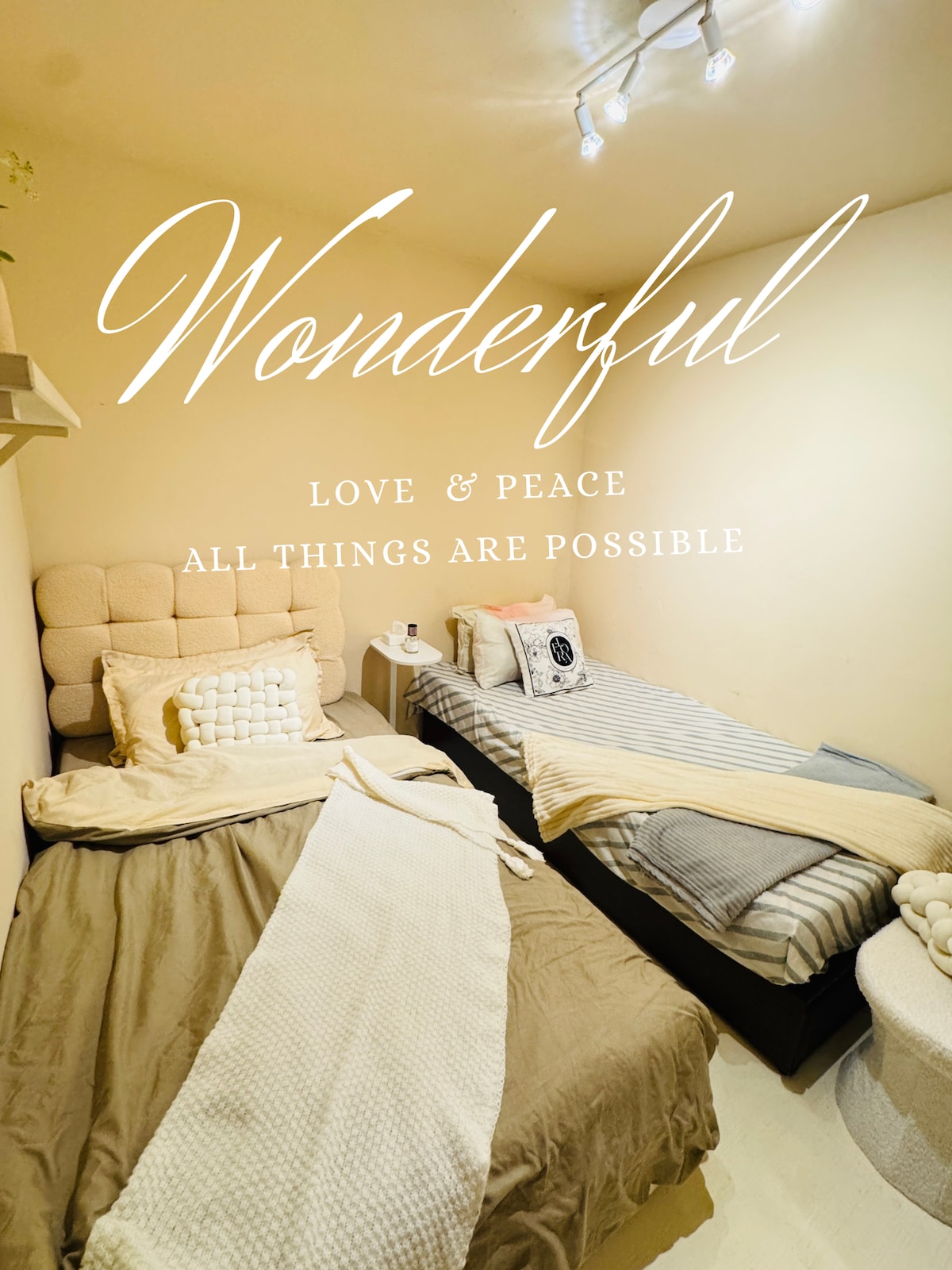 這間公寓風格非常一致:冷色調的灰與黑白配色、乾淨俐落的線條、極簡卻不失質感的裝飾,帶有一點歐式藝術氣息與電影場景感。象徵牆上的相框與城市風景,每一格都是生活的一幕。 一個房間:雙人床(2人) 另一個房間:單人加大(1人) 第四個人地墊床:不介意才訂房(1人) 沙發 吧台 椅子 設備:洗脫烘 2台除濕機 二層大冰箱 三台冷氣 一台電風扇 濾滴咖啡機 咖啡粉 濾紙 鍋碗瓢盆 湯勺鍋鏟,刀叉 筷子 菜刀 棧板 大湯碗 床笠 被套 枕頭加套 額外毛毯 200*230的大被子 韓國洗髮精 潤絲精 沐浴乳 肥皂 卸妝液 化妝棉 乳液 洗面乳 牙膏 毛巾 浴巾 洗衣精 請自備:牙刷 (沒有供應個人牙刷和刮鬍刀)