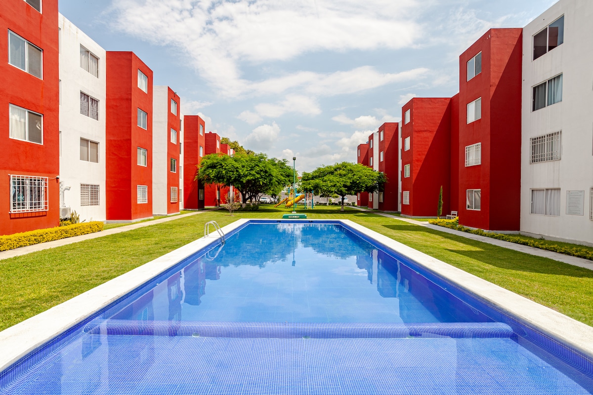 🌿Disfruta de un alojamiento tranquilo y bien ubicado. A sólo 5 minutos en auto del Centro de Cuernavaca, zonas Turísticas, Culturales y Restaurantes. Cómodo, equipado con lavadora en Condominio FAMILIAR y Seguro, Alberca y Área de niños. Entorno tranquilo, excelente para disfrutar; súper céntrico, si estás buscando hospedaje para acudir a un evento o larga estancia. Check in:3pm Check out:11am Se pedirán identificaciones de todos los huéspedes y cumplir con Reglamentos y cuidado del medio