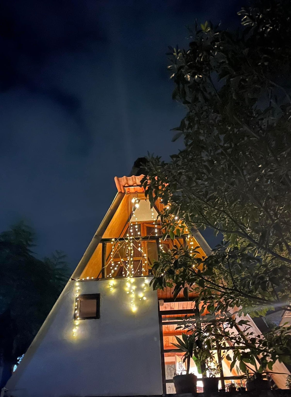 De forma triangular, dos pisos Abajo se encuentra el baño privado, 1 barra con bancos, frigobar, microondas (no cocina); salita tv con DVD Al TAPANCO (ático) se sube por escaleras casi VERTICALES y angostas, ahí se encuentra la cama matrimonial, un balcón con una linda vista, que permite apreciar hermosos atardeceres! Afuera está el jardín, asador y una alberquita con temperatura ambiente (no caldera), los cuales se comparten con huéspedes de una CABAÑA que también rentamos ¡Leer importante!