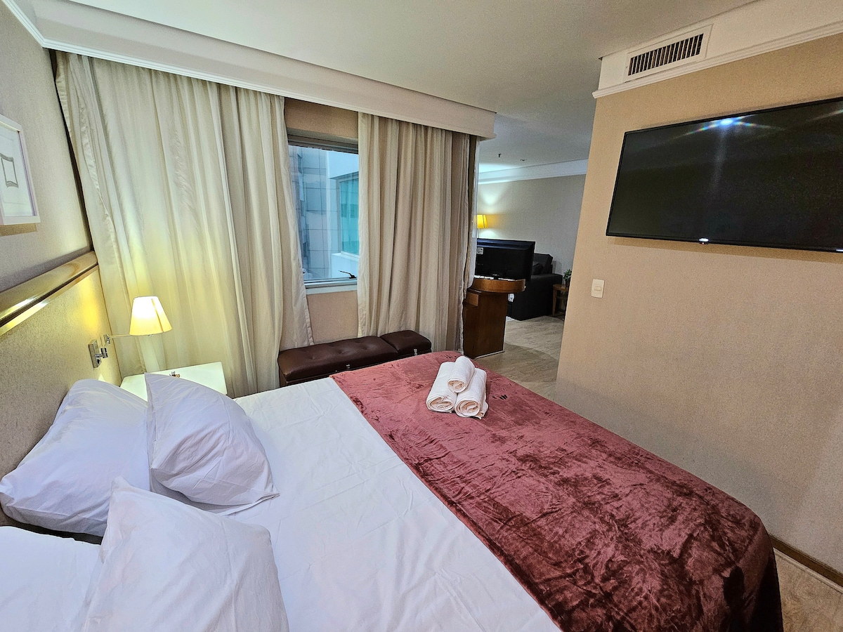 Apto com ar-condicionado, banheiro privativo, TV de tela plana, que pode ser usado para quarto ou para sala, Wi-Fi gratuito, mesa de trabalho, sala e cozinha compacta equipada e uma vaga de estacionamento. O prédio ainda conta com restaurante no piso térreo, academia bem equipada e piscina. Shopping JK Iguatemi esta 100m bem como Parque do Povo O aeroporto mais próximo é o Aeroporto de Congonhas cerca de 6 km. Transporte coletivo, como ônibus e trem que interliga com metrô tudo bem perto.