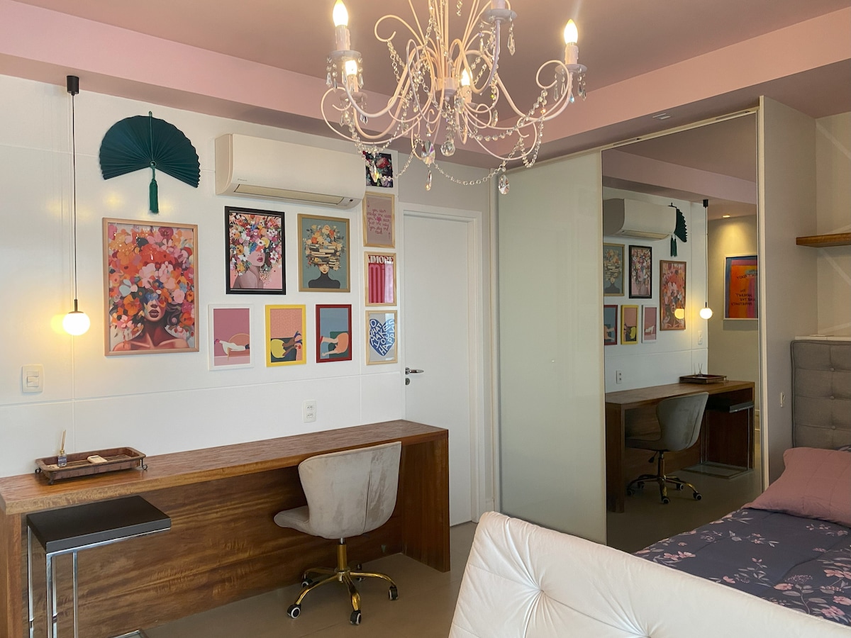Curta uma experiência elegante neste lugar bem-localizado. Studio charmoso, bem decorado e aconchegante com vaga de garagem num prédio com piscina na cobertura. Salão de festas, lavanderia, brinquedoteca, academia e loja do Pão de Açúcar Minuto (mini-mercado) no térreo. Com opção do fechamento/abertura dos vidros da varanda da um ar de casa com a segurança de um condomínio. Muitos armários e utensílios domésticos dão ao hóspede a sensação de estar em casa. Wi-Fi VIVO FIBRA 600 Mbps.