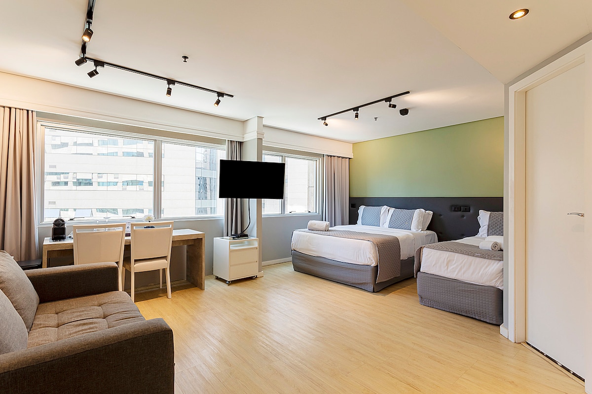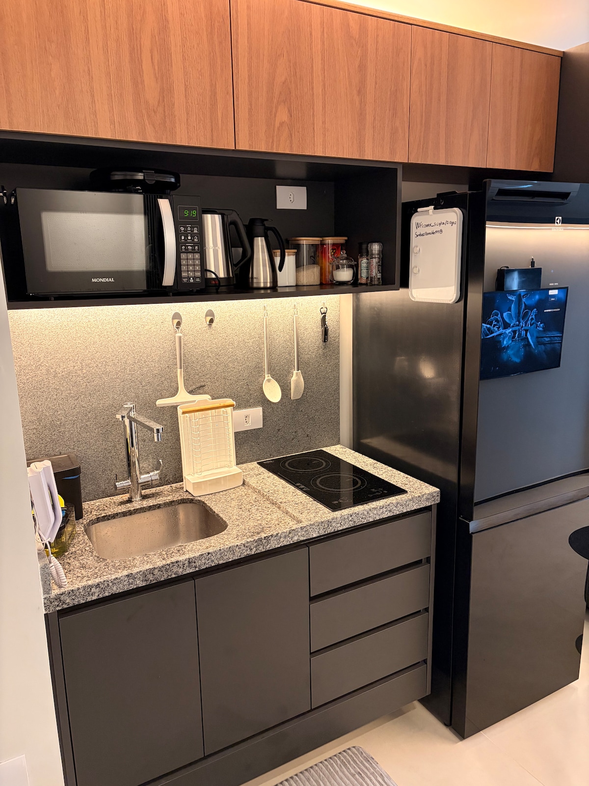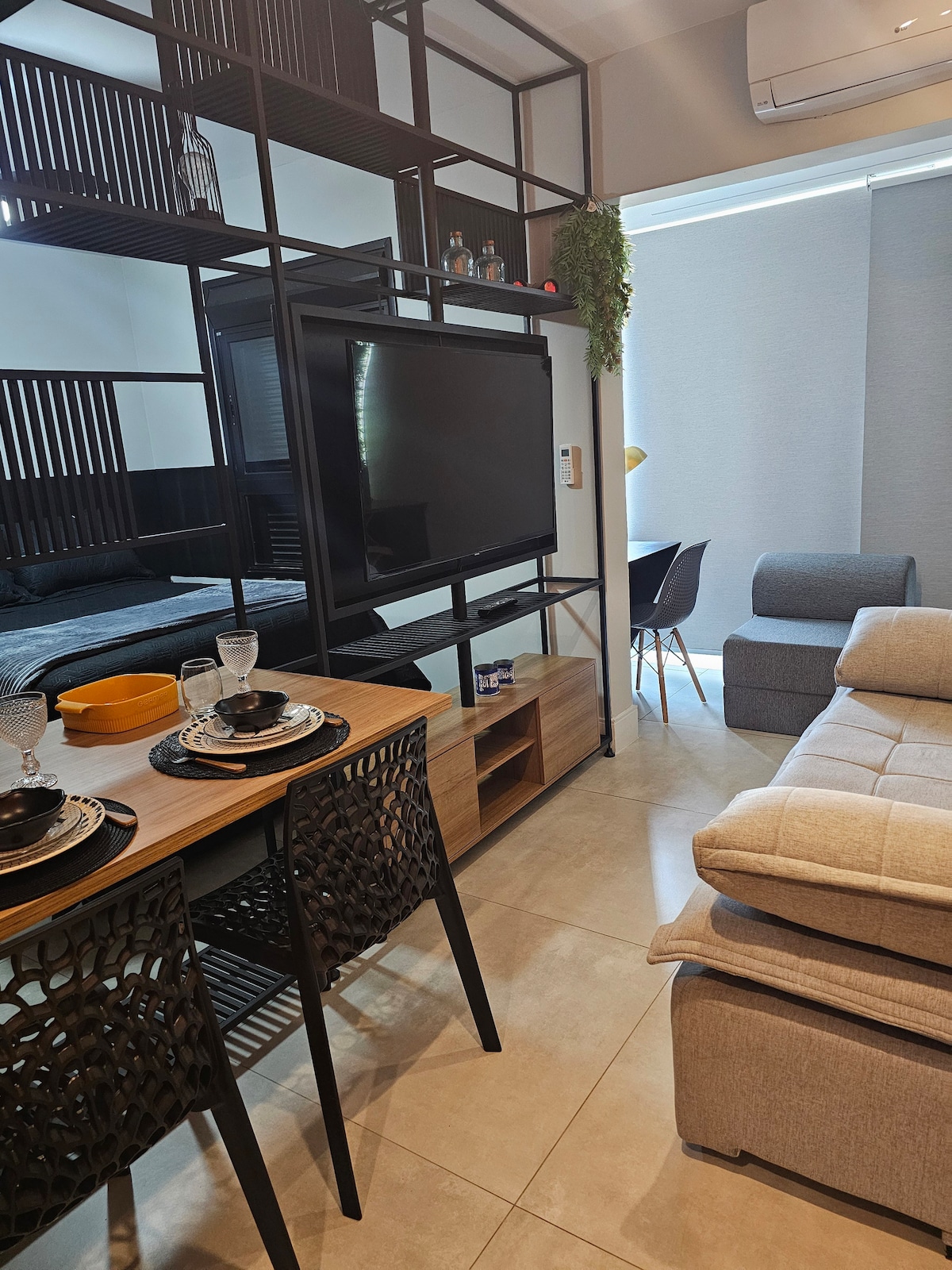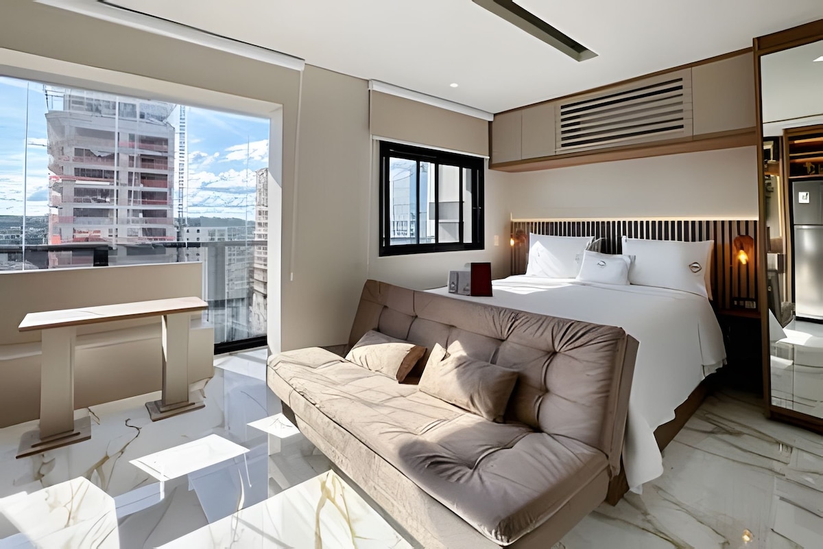 Experience One Eleven in Vila Olimpia. This modern apartment features large windows with breathtaking city views and natural light. The unit boasts 600 Mbps internet and a 4K HD TV. For total comfort, it has a Hot/Cold AC system: 27,000 BTU/h unit in the living room and 10,000 BTU/h in the bedroom. The bedroom is quiet and dark for a restful sleep. Impeccably maintained, you’ll be walking distance to top restaurants and business hubs—a safe, upscale retreat with a stunning urban backdrop.