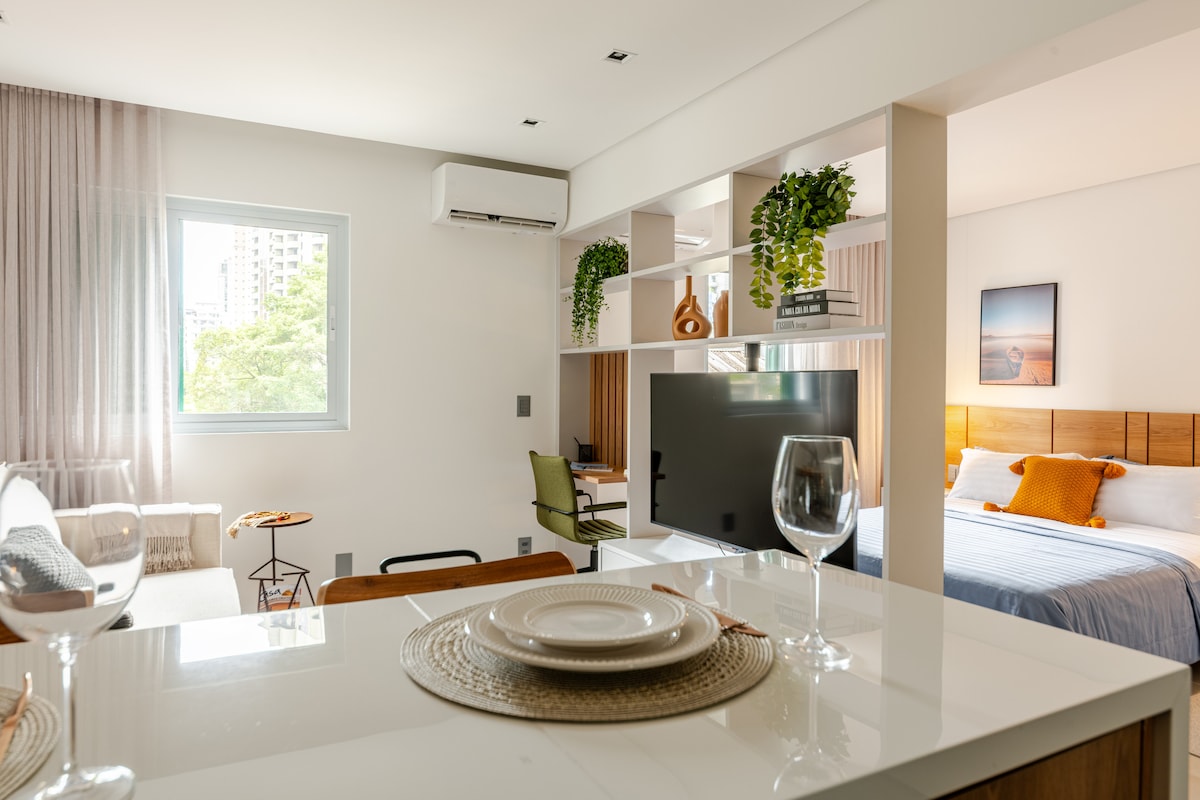 Experience One Eleven in Vila Olimpia. This modern apartment features large windows with breathtaking city views and natural light. The unit boasts 600 Mbps internet and a 4K HD TV. For total comfort, it has a Hot/Cold AC system: 27,000 BTU/h unit in the living room and 10,000 BTU/h in the bedroom. The bedroom is quiet and dark for a restful sleep. Impeccably maintained, you’ll be walking distance to top restaurants and business hubs—a safe, upscale retreat with a stunning urban backdrop.