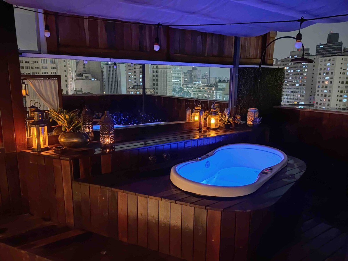 Cobertura deslumbrante com a melhor vista da cidade de São Paulo. Equipado com um terraço privativo com Sauna de vidro com vista panorâmica, jacuzzi super aquecida com hidromassagem e iluminação para cromoterapia e um jardim com lindas plantas para um tempo de relaxamento inesquecível. Não há nada igual disponível para uso em São Paulo. O ambiente de cozinha e estar todo de vidro, teto de madeira e equipado com projeto de alta potência para sua sessão de cinema privativo com pipoqueira.