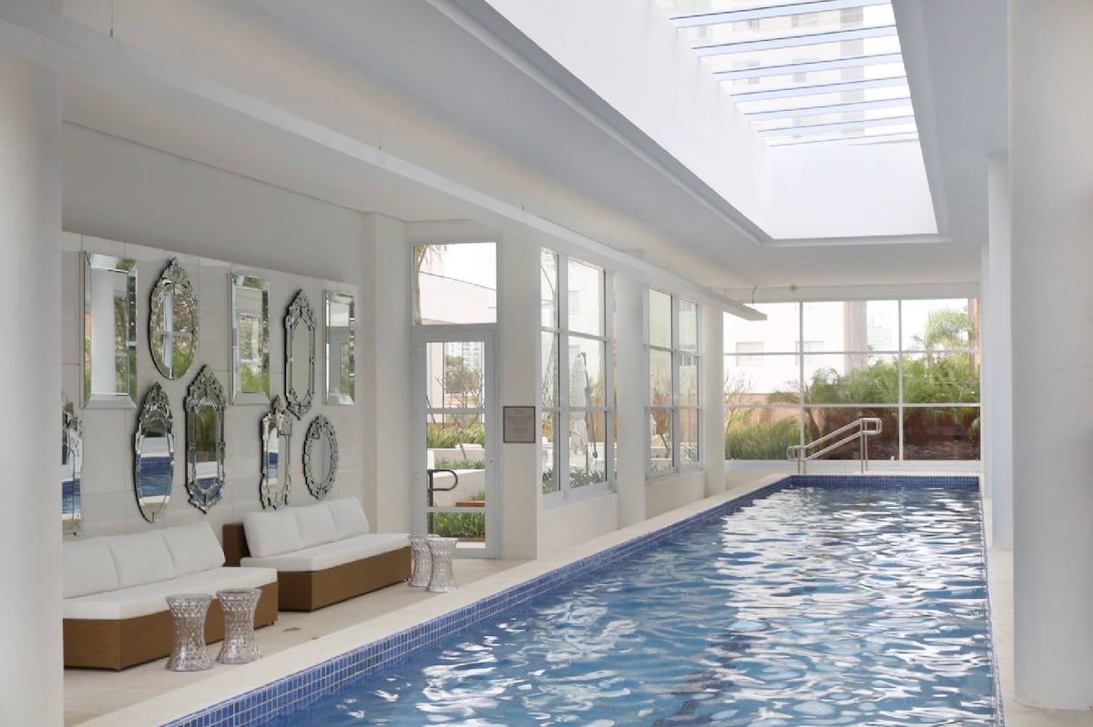 Apartamento completo, com vaga de garagem no condomínio, internet, ar condicionado e ventilador de teto, microondas, geladeira, fogão elétrico, localizado à 950m da Estação Campo Belo do metrô, num condomínio com piscina ao ar livre na cobertura, piscina aquecida, quadra de tenis, academia super equipada, loja de conveniência, sauna e spa, espaço co-working, lavanderia, serviço de camareira e portaria 24 horas