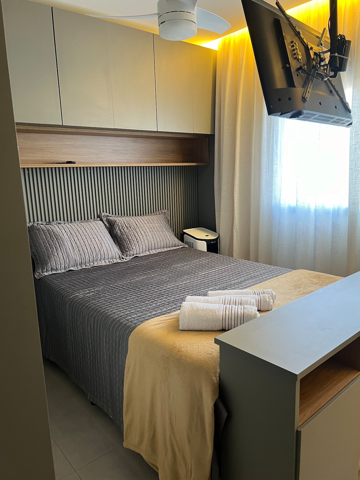 Experience One Eleven in Vila Olimpia. This modern apartment features large windows with breathtaking city views and natural light. The unit boasts 600 Mbps internet and a 4K HD TV. For total comfort, it has a Hot/Cold AC system: 27,000 BTU/h unit in the living room and 10,000 BTU/h in the bedroom. The bedroom is quiet and dark for a restful sleep. Impeccably maintained, you’ll be walking distance to top restaurants and business hubs—a safe, upscale retreat with a stunning urban backdrop.
