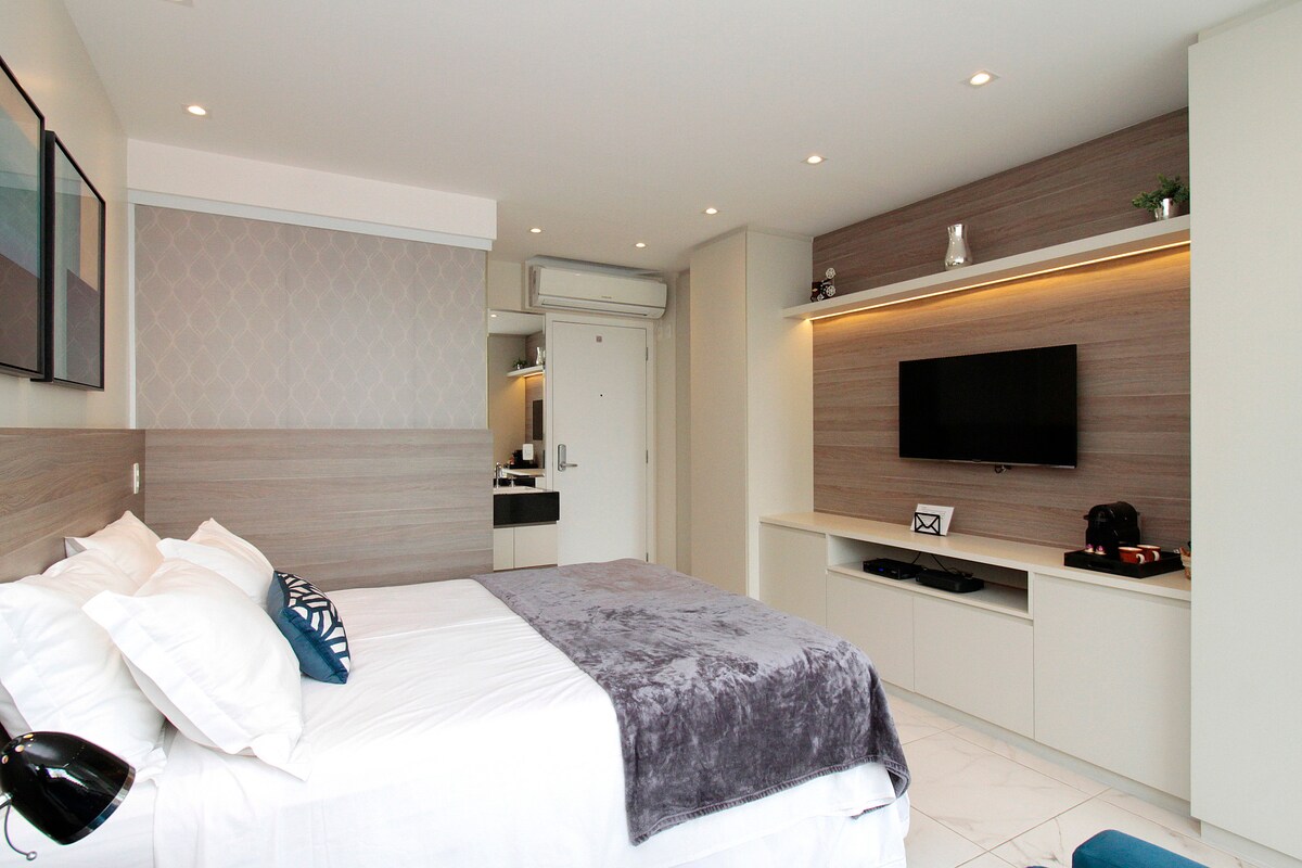 Modern and sophisticated studio, in the best location of Vila Olímpia, the neighborhood with the most modern, and trendy business center of SP. Safe building, equipped with 24-hour reception, swimming pool with lane and wet deck, gym, laundry, lounge with pool table and bike sharing. It has a Queen size double bed, 1 sofa bed and extra mattresses that can accommodate up to 4 people. Close to shopping malls, restaurants, bakeries, ballads, supermarkets, pharmacies, bike lane and train station.