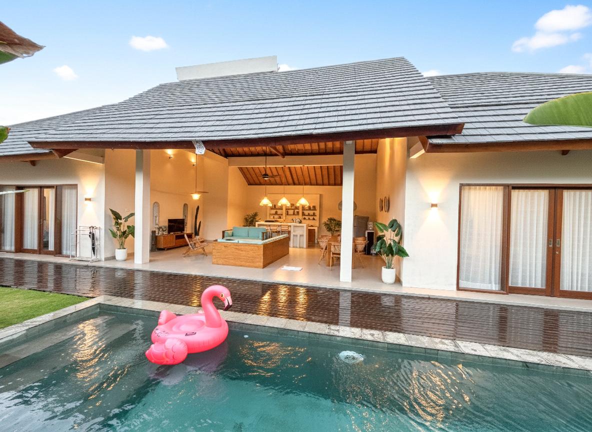 The villa is set above 150 meter square land in a charming tropical villa compound located between Seminyak and Canggu where sunset beach with many lovely cafés and beach clubs is only 4 minutes walk. The villa comes with daily cleaning service, breakfast, private pool with day bed, large living area, fully equipped kitchen , open-air bathroom with bath tub and outdoor shower.