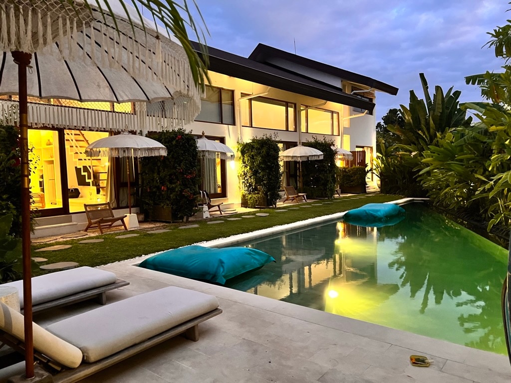 Reliable high-speed internet, cable TV, all bills and daily cleaning included. Free fruit breakfast on request. Stay in the heart of Canggu on Batu Bolong—steps from top cafés, bars and world-class surf. Enjoy natural light, a comfy bed. Your own private pool and sundeck, ocean views, a marble dining table for 6 and lofty, breezy ceilings.
