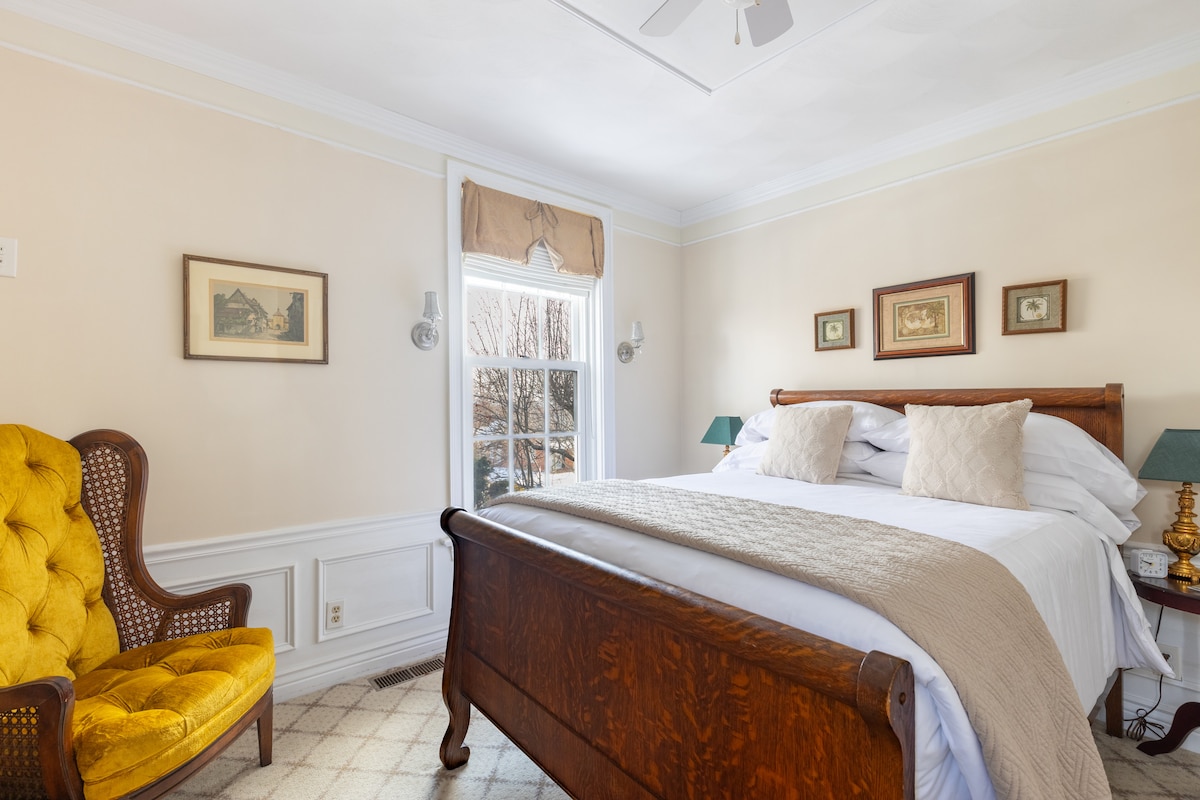 Welcome to the Painted Cat of Galena, a cozy Victorian B&B with feline flair! The Persian Room is pink, playful & the perfect place to experience Victorian glamor. Featuring a cozy sitting nook in the bay window, you'll find amazing views of the historic neighborhood. Also features an ensuite bathroom with a pink claw-foot tub. Includes a Roku HDTV, window AC, electric fireplace and steam heat. Daily breakfast included with your stay! Proudly welcoming cat lovers of all stripes 🏳️⚧️🏳️🌈