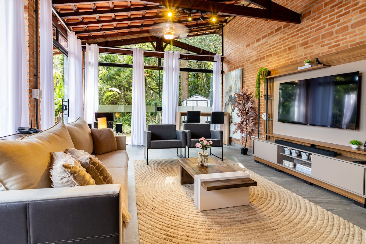 Eu e meu marido Oscar projetamos a casa, que era para ser a nossa morada, mas resolvemos compartilhar e proporcionar experiências a pessoas que se sentem atraídas por esse estilo de vida. Estamos em meio a natureza e temos uma mata linda e exuberante próxima a casa, animais silvestres passeiam pelos arredores. Fiz a decoração da casa com muito carinho e planejamos um ambiente bem arejado e iluminado para receber vocês.
