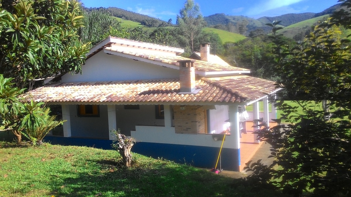 Casa ampla em chácara nas montanhas, ao lado de Mata Atlântica nativa. Perfeito para um fim de semana romântico, viagem de amigos ou de família. Bastante iluminada e arejada, tem três quartos (um deles fica no mezanino da sala), cozinha completa com fogão a lenha, pergolado coberto com churrasqueira e forno de pizza, varanda com ofurô no quarto do casal. Linda vista e pomar. Pet friendly. Local de acesso fácil, estacionamento para 5 carros. Pacote SKY e Wifi banda larga sem limites.