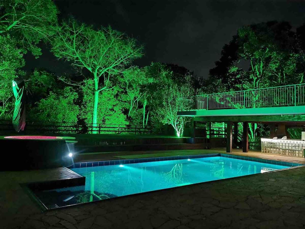 有景观、瀑布、壁炉和游泳池的小屋。