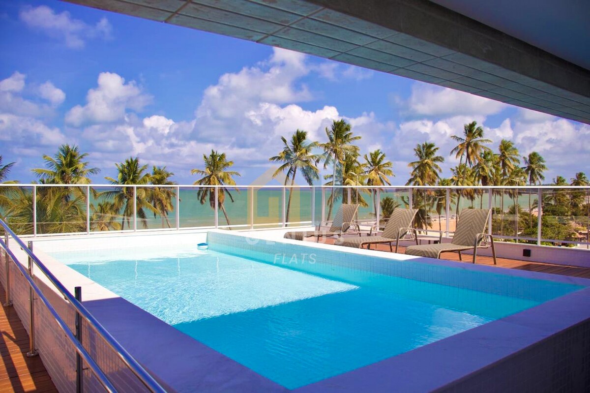 Seu destino de férias no paraíso. Empreendimento novo, entregue em agosto 2022, à beira-mar do Cabo Branco - a praia mais cobiçada de João Pessoa. E com estrutura completa (piscina na cobertura, academia, brinquedoteca, lavanderia, cinema, salão de jogos, recepção 24h e acessibilidade). É vizinho ao Parque Cabo Branco (espaço kids, artesanato, gastronomia, apresentação de grupos musicais, etc). Quanto ao flat, fica no 2º andar, frente mar, com varanda, móveis planejados, eletros novos.