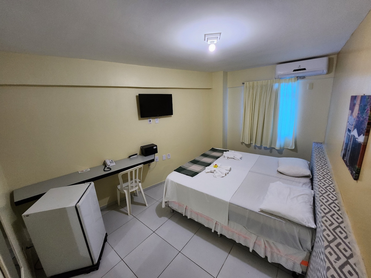 Confortável Suíte de 17m², equipada com ar condicionado, chuveiro elétrico, cama de casal, frigobar, cadeira de apoio, tv á cabo e com streaming, armário com cabides para roupas. Bem localizada, a beira mar de João Pessoa, ao lado do Mag shopping e próximo ao shopping Manaíra, próximo também de bares, restaurantes, sorveteria, padaria, local ótimo para caminhadas na praia ou no calçadão de Manaíra.