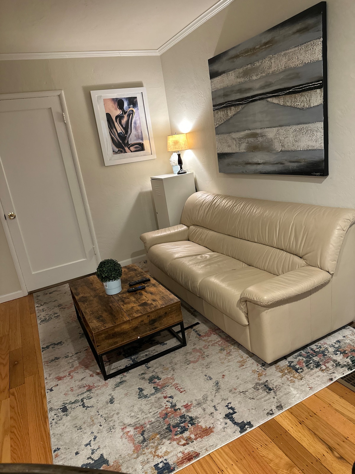 Relax in this tranquil space nestled in Oakland Hills. Private inlaw unit furnished with modern furniture and art. Kitchen replete w/microwave-convection oven, induction cooktop, dishwasher, coffeemaker, prep tools and serving items await. Enjoy the electric fireplace, cable TV and high-speed WiFi. Stylish bathroom and comfy bed to refresh and relax. From the off-street parking spot, take the 30 well-lit and stable stairs to this quiet home away from home. No pets or smoking on premises. Enjoy!