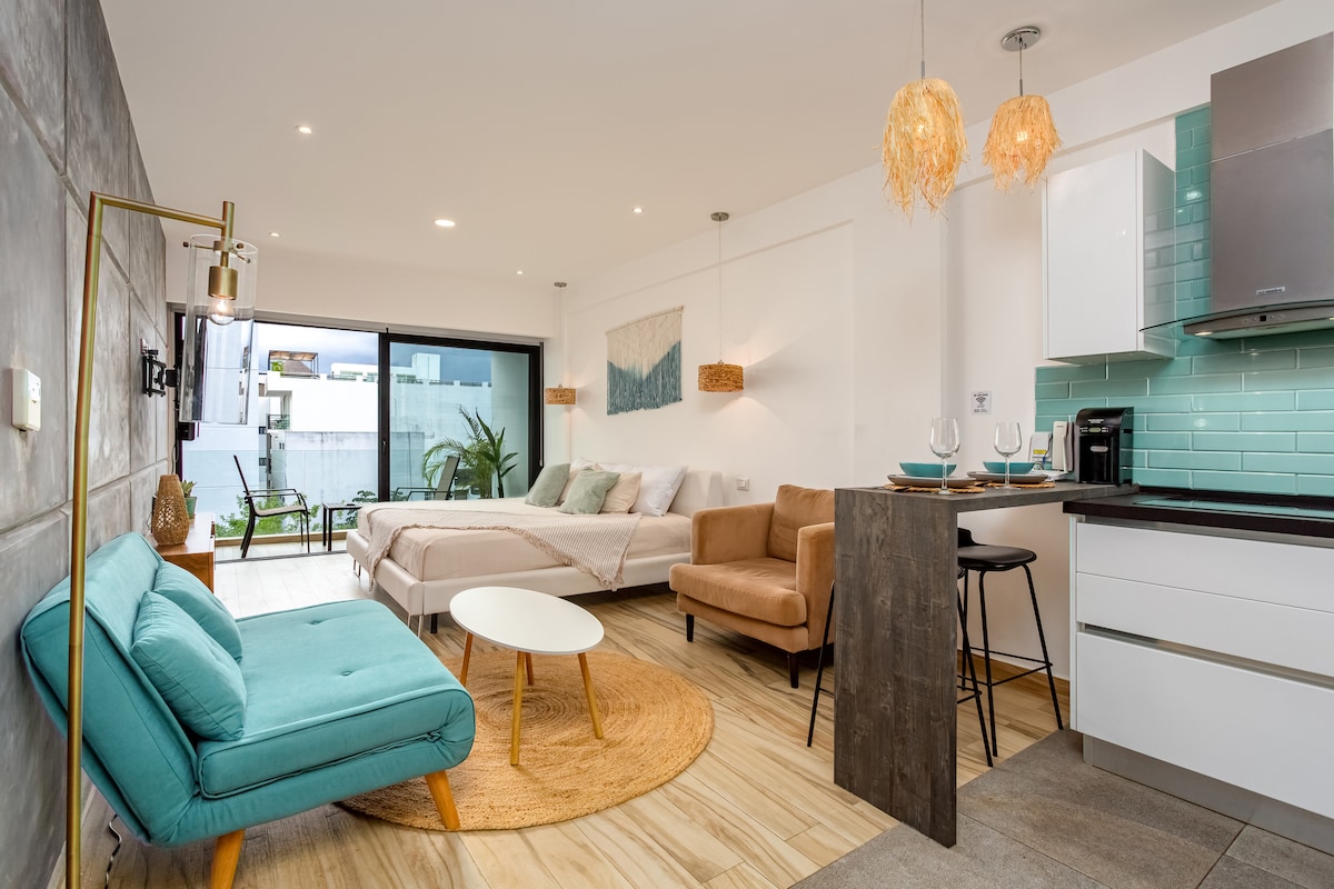 Cute, modern studio in a brand new building in the center of town. Very safe area, secure building with 24/7 guard & parking garage (limited spaces, first in-first served). 3 min walk to the Hilton beach & a 10 min walk to the happening Mamitas party beach. Practically on the corner of the famous 5th Ave (La Quinta), with plenty of bars and restaurants around to enjoy nightlife.