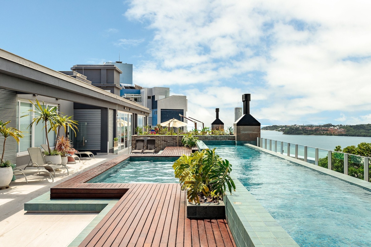 Cobertura de frente pro mar, Ocean front Penthouse, com decoração moderna e muitos detalhes que vão fazer você sentir um gostinho da ilha de Bali estando em Florianópolis. Já imaginou desfrutar da vista da ilha do Campeche até a Joaquina relaxando em uma rede ou curtindo bons momentos dentro da piscina com borda infinita? Ofereça um churrasco para os amigos enquanto a brisa do mar torna o ambiente ainda mais confortável. Esses e muitos outros detalhes fazem desse um espaço mais que especial !