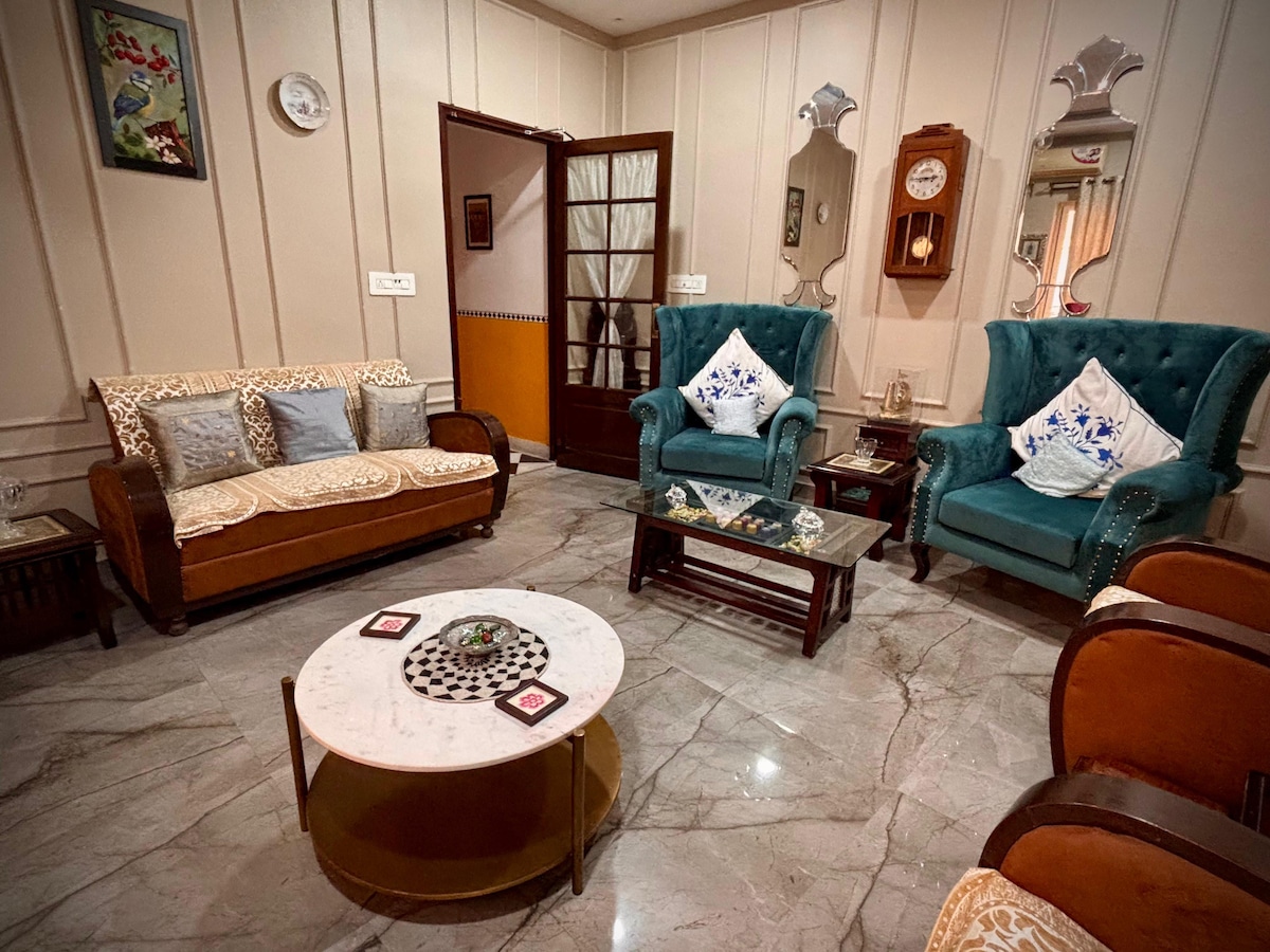 Step into a 90-year-old vibrant heritage haveli and enjoy soulful, homely ,cultural living. Centrally located within 5 km of railway station, airport, bus stand & major sights—yet peaceful and away from the city’s hustle.Enjoy free parking, a shared dining area, and kitchen & laundry access (nominal charge). With easy connectivity, cabs and food delivery are just a call away.Hosted by an experienced Superhost, the space is designed around the harmony of 5elements for a peaceful, memorable stay