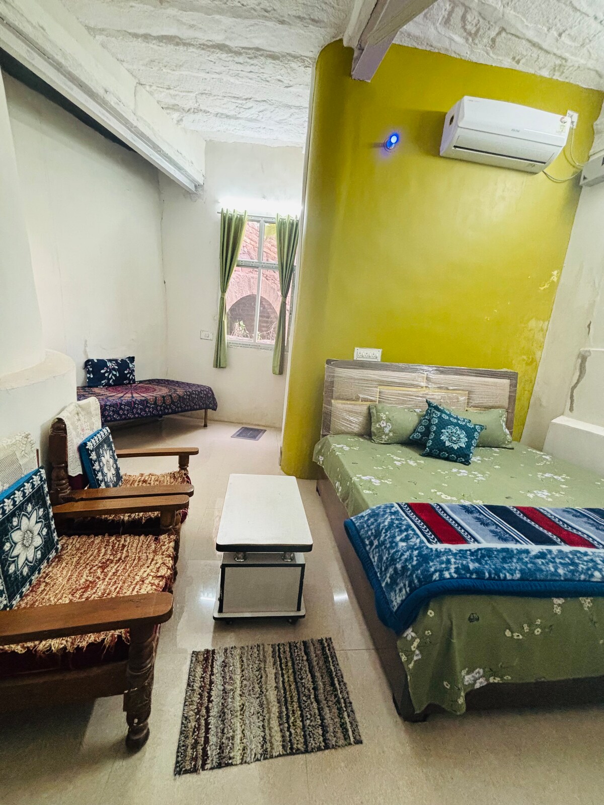 We have two types of rooms, 1 AC room and 2 non-AC rooms, but coolers are available. Mehrangarh, Jaswant Thada, Turji's stepwell, clock tower, main market is close to the guest house. The view of the city from the roof is very good.