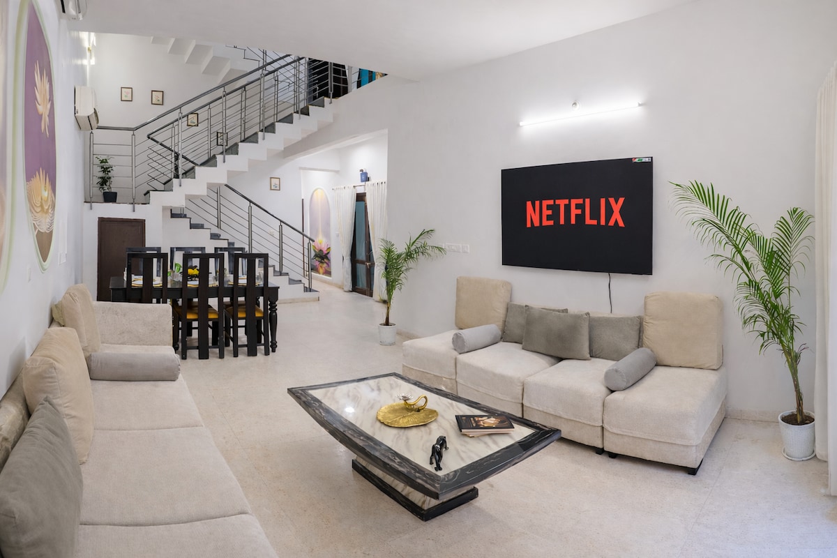 Enjoy a luxurious stay in fully independent Villa featuring 3 KING SIZE BEDS, SPACIOUS ROOMS, FULLY EQUIPPED FAMILY KITCHEN, MULTI-LEVEL PRIVATE TERRACE, GARDEN, and BONFIRE AREA - all within a grand villa that’s entirely yours. 🏢 Amenities High-speed Wi-Fi 55" Smart TV with Sound Bar Karaoke setup Indoor Games Fully equipped kitchen Air-conditioned rooms with attached washrooms Private free parking (up to 5 Cars) RO water purifier installed (Geyser available in kitchen) & MANY MORE...