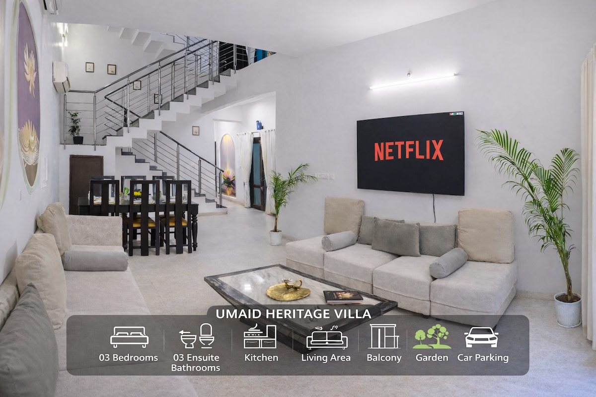 Luxurious place consisting of Six Bedrooms with attached W/C, a Bathroom and Balcony in the heart of the city. Dis. to Airport 5 mts Railway Station 8 mts. & 10 mts. from City Center by car. The property is in best locality of Jodhpur, foothills of the Umaid Bhawan Palace, voted by the UN as the world's best heritage Hotel of 2018. From Terrace, the view of Umaid Bhawan is just amazing 300 Mts away. Ample Parking, a common huge sitting area small gardens at the Entrance and back of the Villa